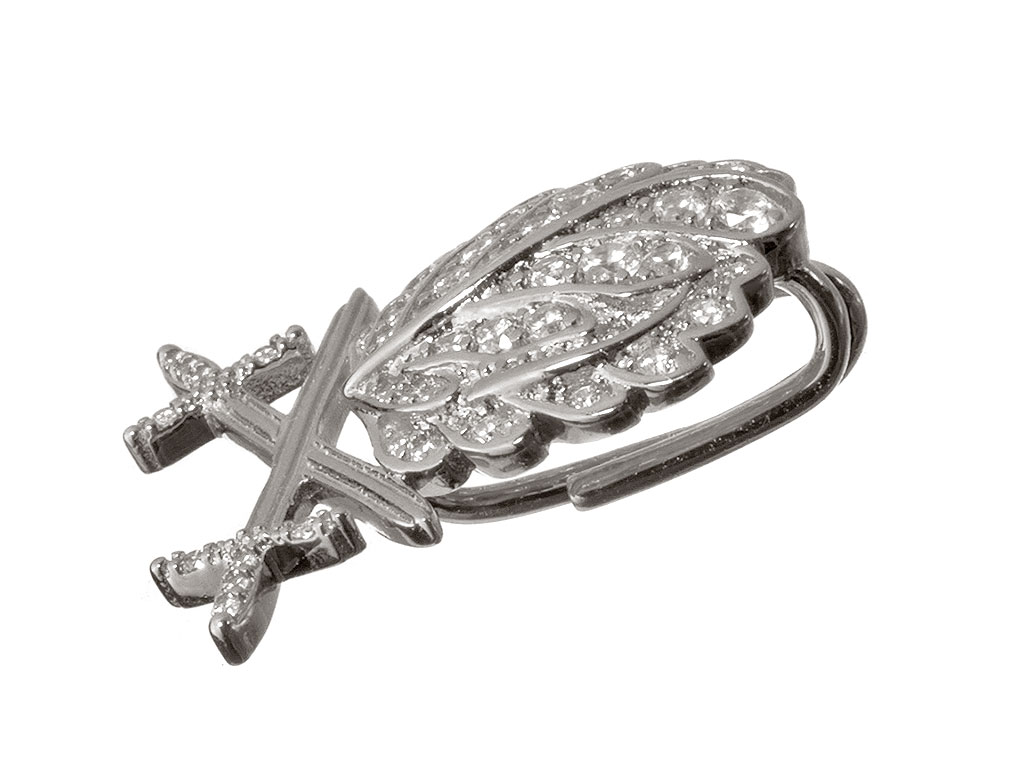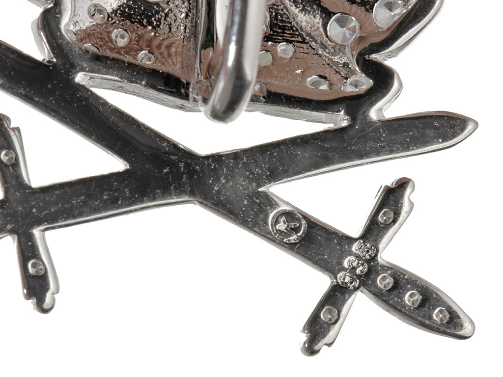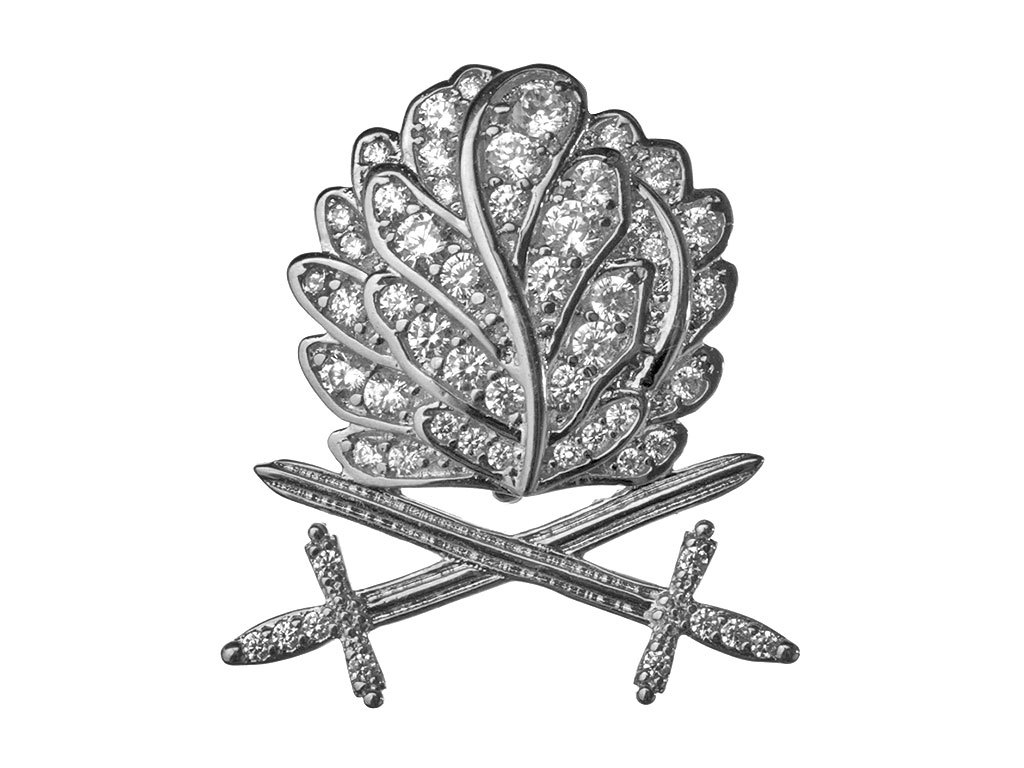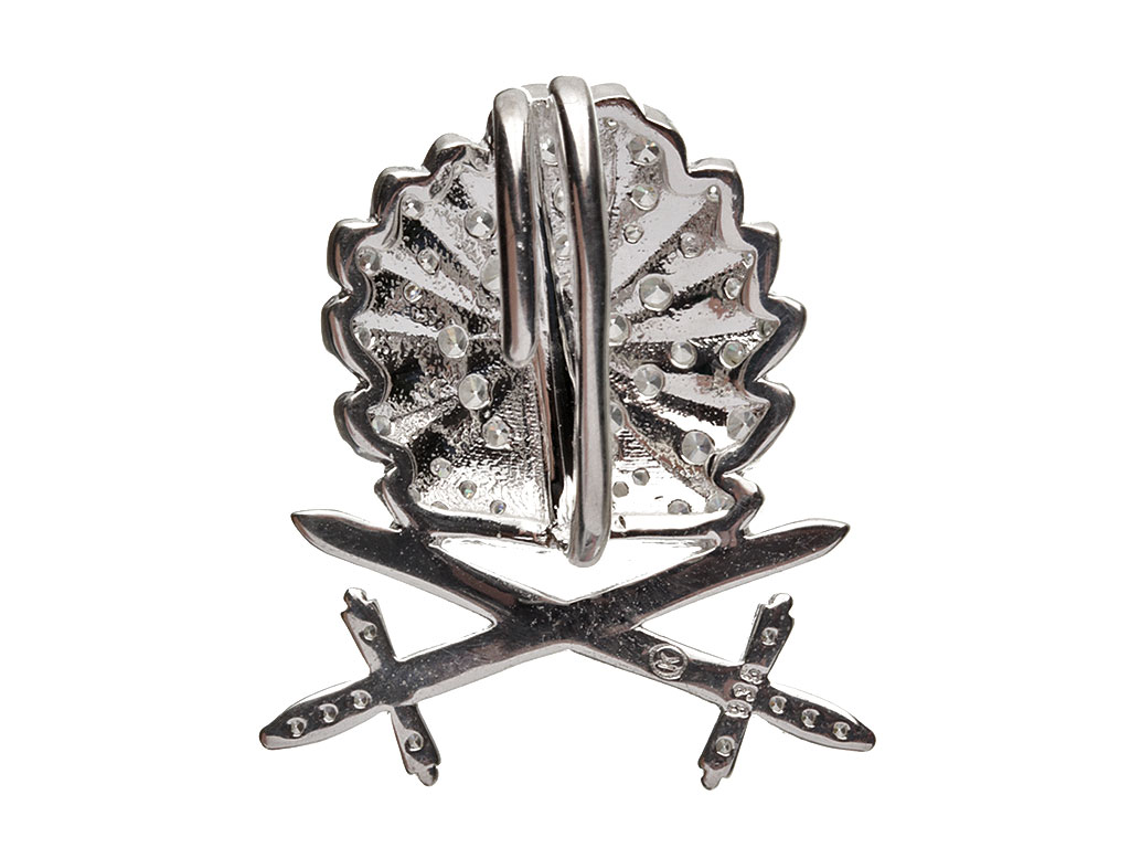 Превосходного качества копия высшей военной награды Третьего рейха - "Дубовых листьев с мечами и бриллиантами" к Рыцарской степени Железного креста. Размер и внешний вид полностью соответствует оригиналу. Копия изготовлена из посеребренной латуни, инкрустирована ограненными фианитами.