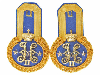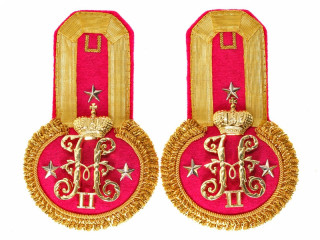 Эполеты морские адмирала Свиты ЕИВ, при форме Гвардейского экипажа, с бахромой. Золотое тканое поле, красный п...