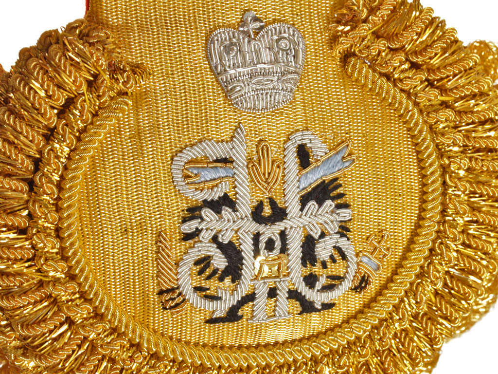 Шитый серебряной канителью вензель Н2 на фоне черного Имперского орла.