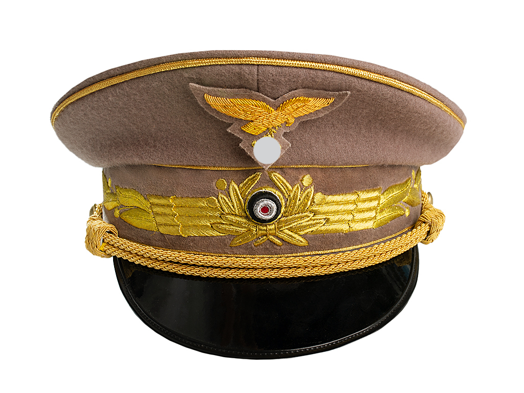Фуражка Люфтваффе имела тот же базовый дизайн Вермахта, но с серо-голубой тульей и черным бархатным околышем. Кокарда на фуражках отличалась наличием стилизованных крыльев. Отличался так же своим видом орел на тулье. Офицеры носили двойные серебряные шнуры (трунцал) с гайками для регулировки. Шнур крепился на две серебряные 12 мм пуговицы. Парадная фуражка генерал-фельдмаршала Люфтваффе Германа Геринга отличалась особым высоким качеством материала. Околыш и тулья изготовлены из светлого серо-голубого сукна. Шнур (трунцал) над козырьком свивался из золотистых прядей с регулировочными подвижными плетеными гайками и пристегивался к 12-мм золоченым пуговкам. Как и на повседневной фуражке генерала Люфтваффе на фуражке Геринга орел и венок кокарды в виде венка из дубовых листьев с желудями и стилизованными крыльями, вышивались тонкой золотой канителью. Посередине дубового венка кокарды помещена вышитая круглая трехцветная имперская кокарда. Так же по всей длине околыша фуражки генерал-фельдмаршала Люфтваффе Германа Герина вручную золотой канителью вышит лавровый венок. Имперский орел Люфтваффе вышит на тулье тонкой золотой канителью, с размахом крыльев 60 мм, подклад в цвет тульи. Фибровый козырек – правильной циркульной формы с ободком по наружному краю, сверху покрыт черным лаком, а с изнанки в мелкую насечку окрашен в золотисто-коричневый цвет.
