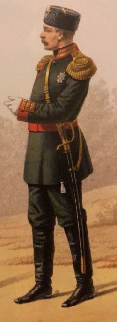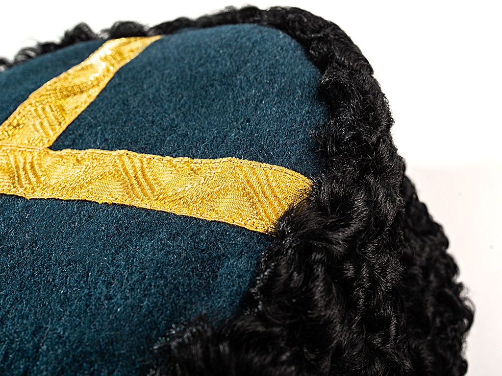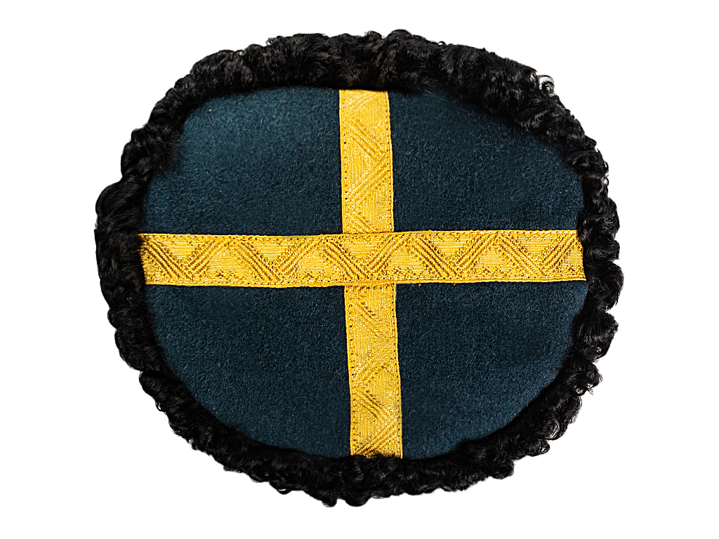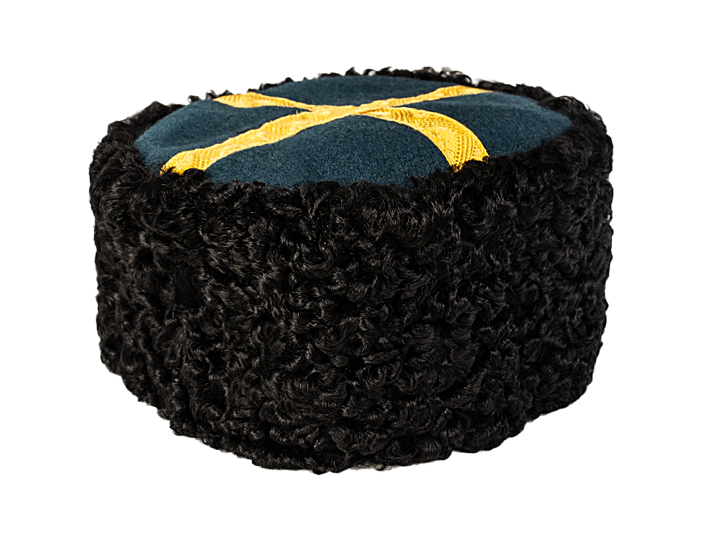 «3. Круглая шапка из черной мерлушки (приказ 1881г. №313) имеет донышко черного сукна, с крестообразной на нем нашивке золотого узорчатого «генеральского» галуна, шириною в 5/8 дюйма…»