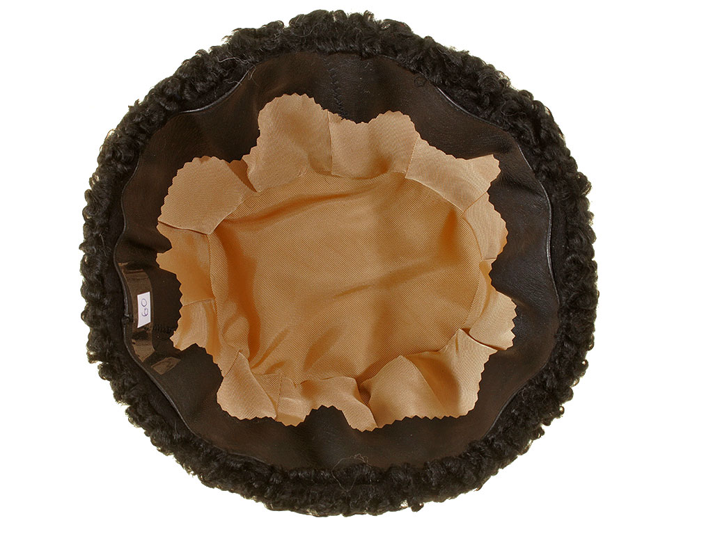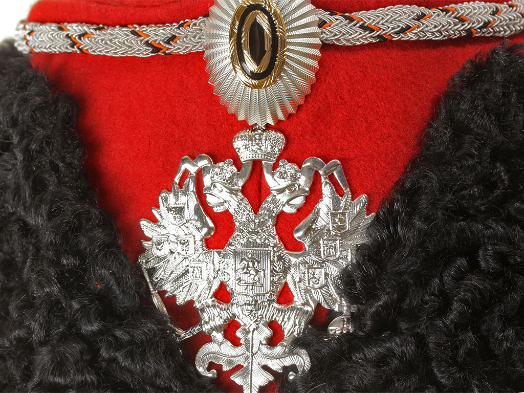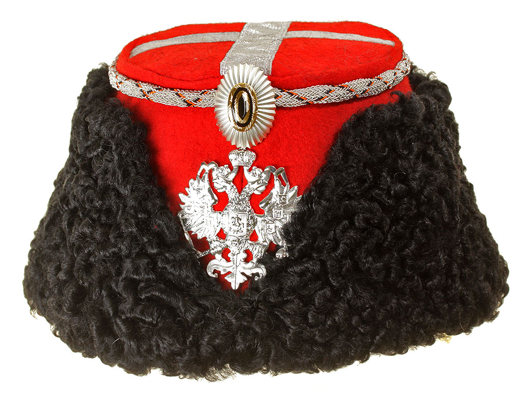 Натуральный каракулевый мех, подбита натуральной кожей, подкладка из муара, в комплекте: государственный герб латунный посеребренный и кокарда малая образца 1881 года.