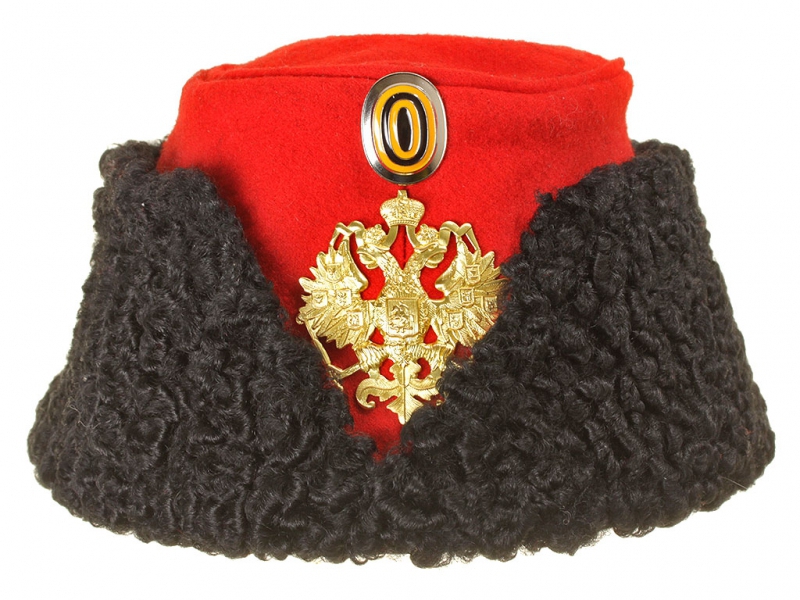 Натуральный каракулевый мех, подбита натуральной кожей, в комплекте: государственный герб желтый латунный и кокарда малая образца 1881 года.