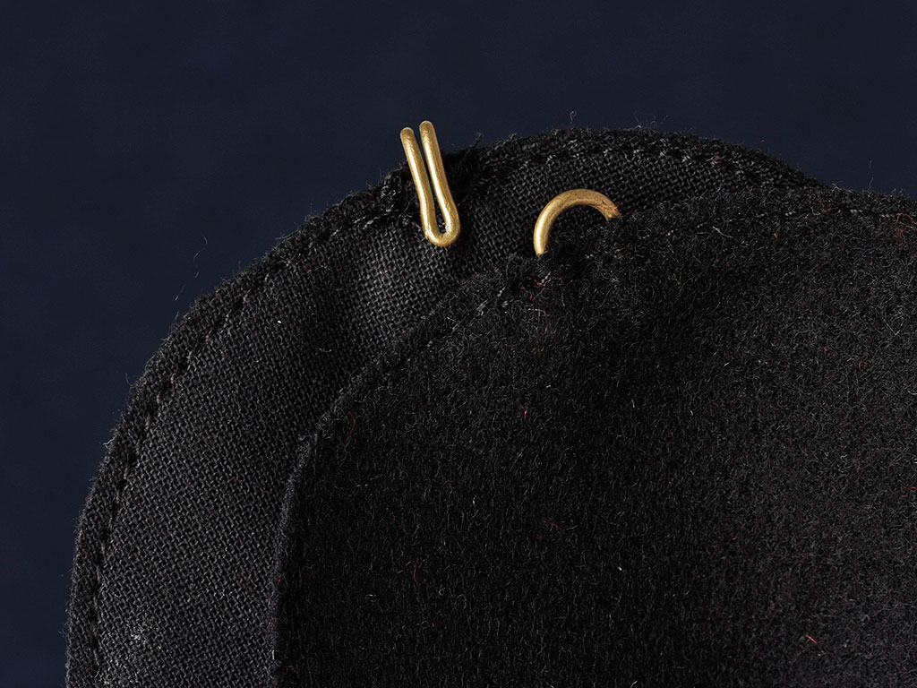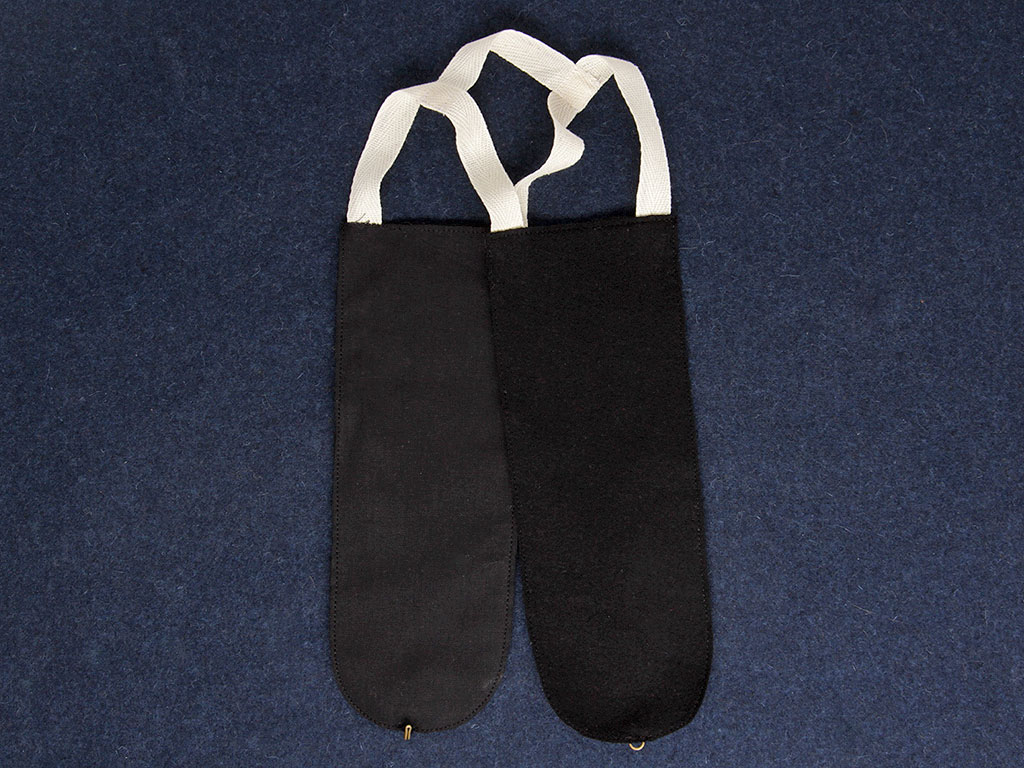 Верхние концы обоих суконных клапанов соединяются между собой тесемками, пришиваемыми по их краям, впуская концы тесемок под подкладку. Тесемки соединяются посередине поперечной такой же тесемкой; длина продольных тесемок должна быть: передней (большей) 3 с четвертью - 3 с тремя четвертями вершка, а задней (меньшей) 2 с тремя четвертями - 3 с четвертью вершка, длина средней тесемки 2 с четвертью вершка.