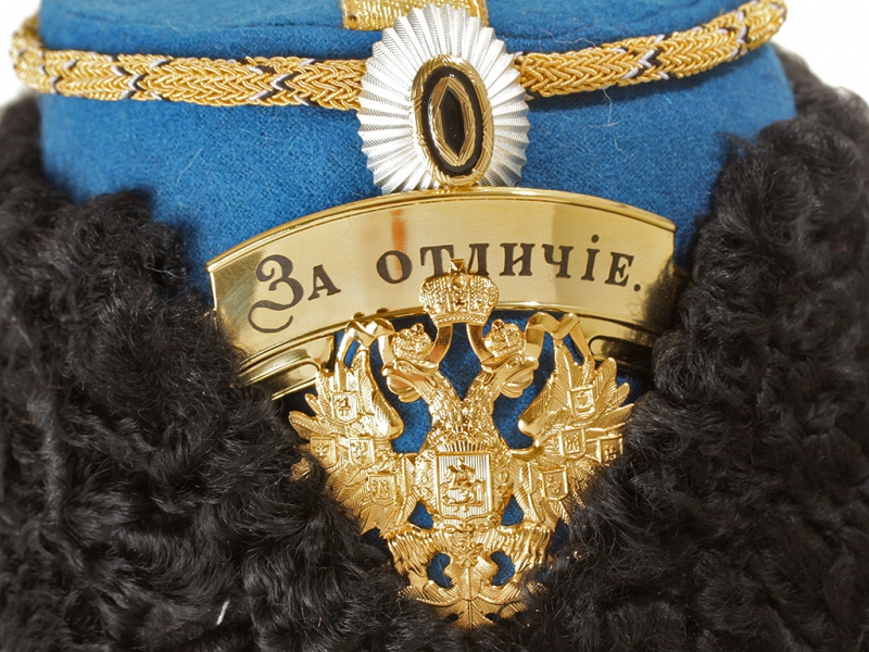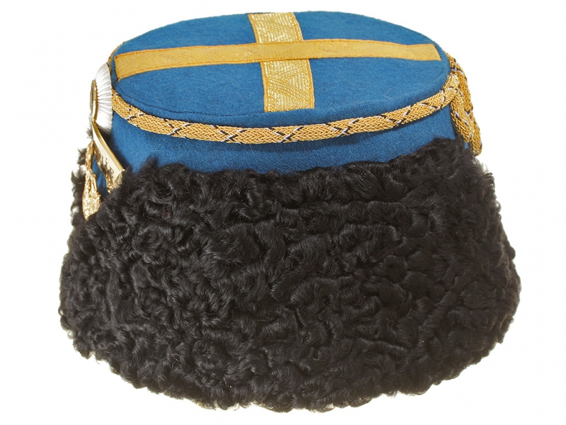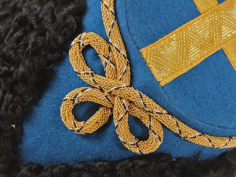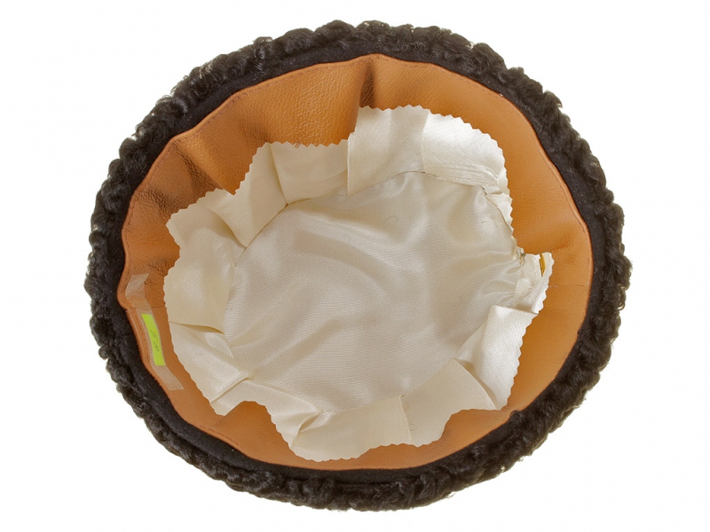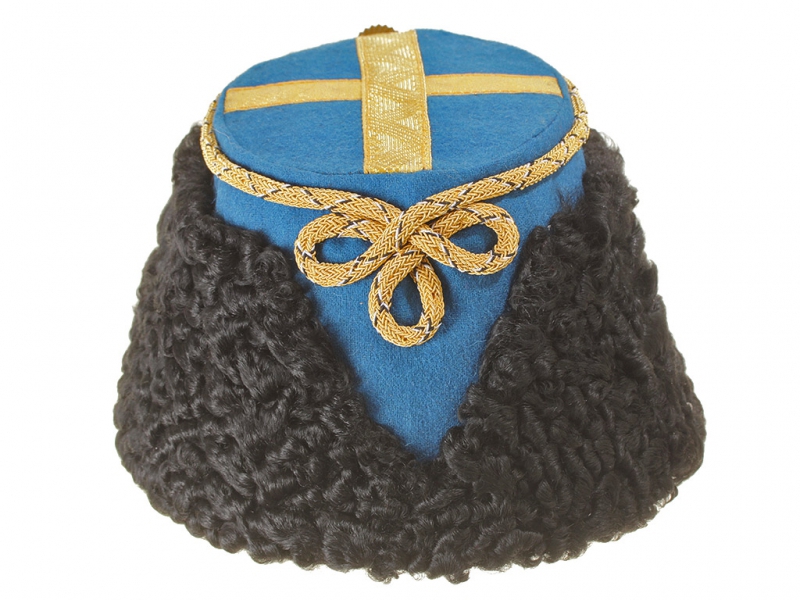 Натуральный каракулевый мех, подбита натуральной кожей, подкладка из муара, в комплекте: государственный герб желтый латунный и кокарда малая образца 1881 года.