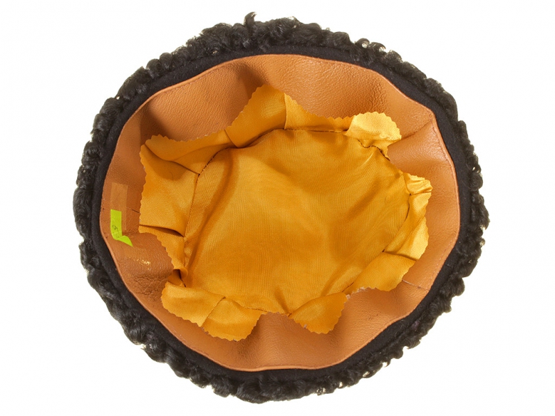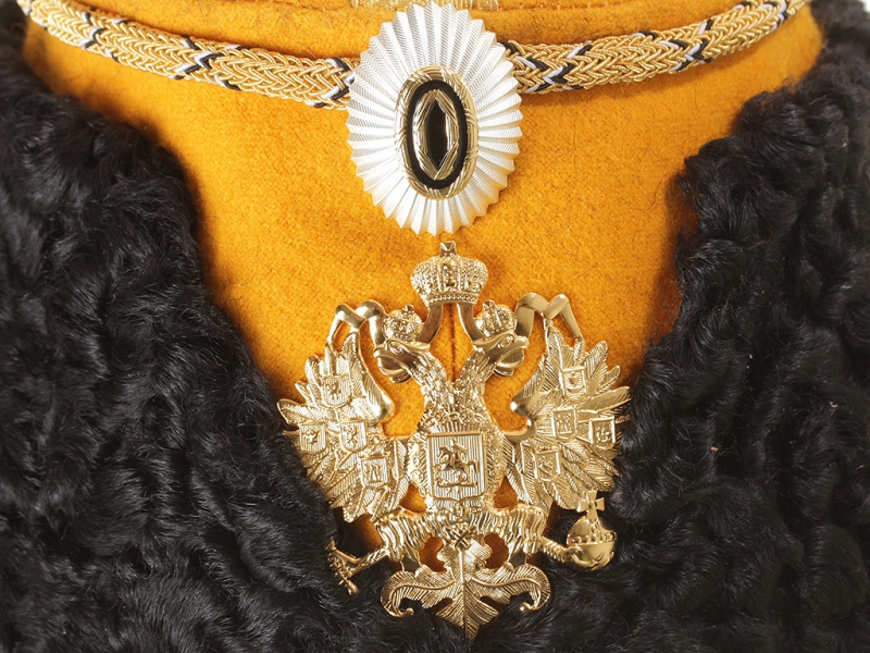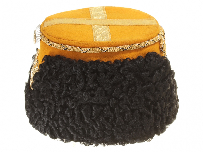 Натуральный каракулевый мех, подбита натуральной кожей, подкладка из муара, в комплекте: государственный герб желтый латунный и кокарда малая образца 1881 года.
