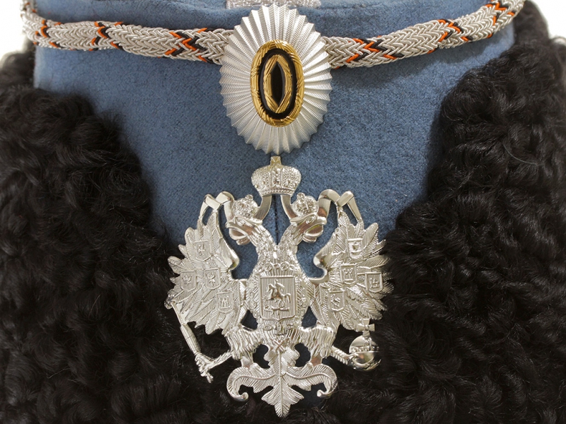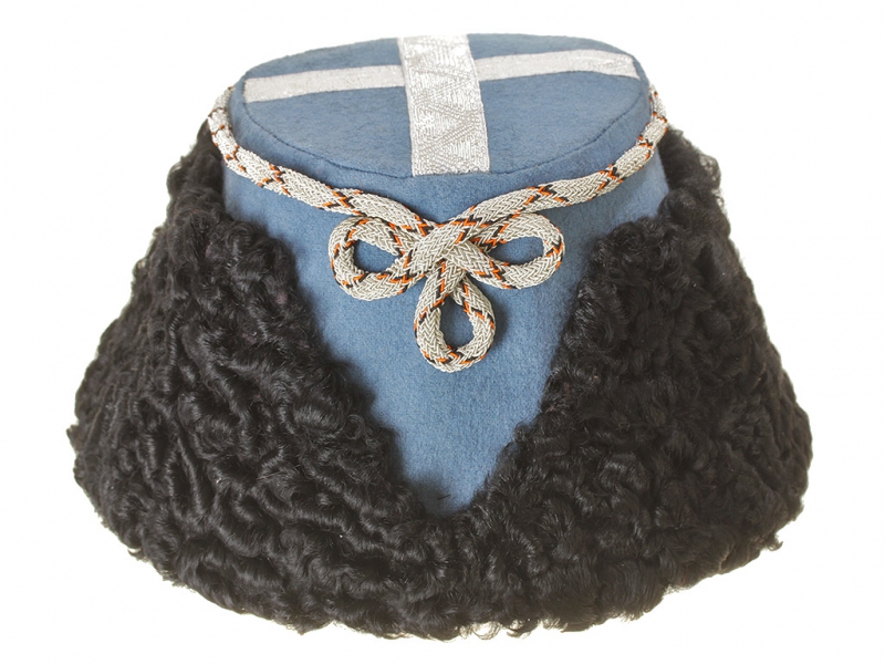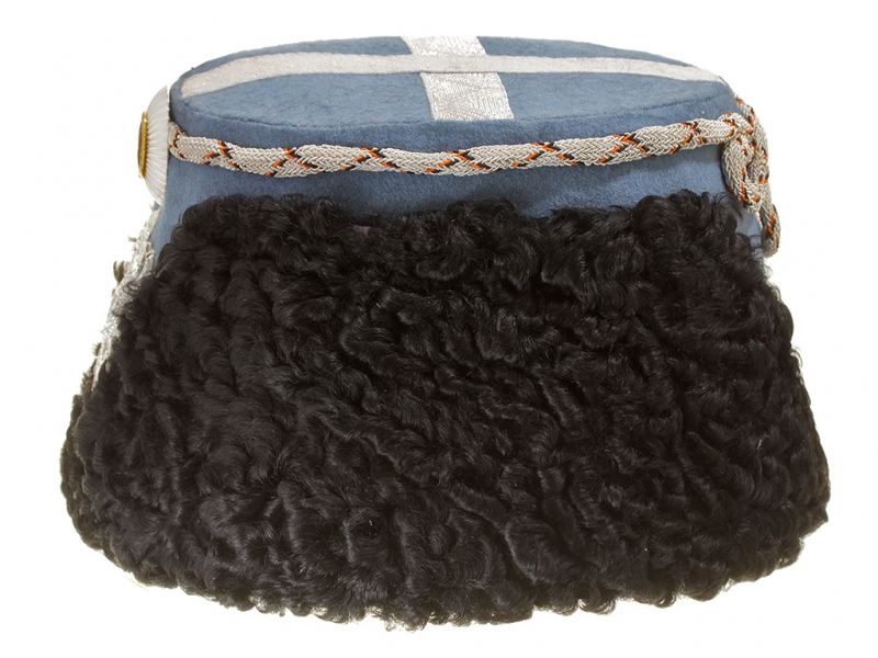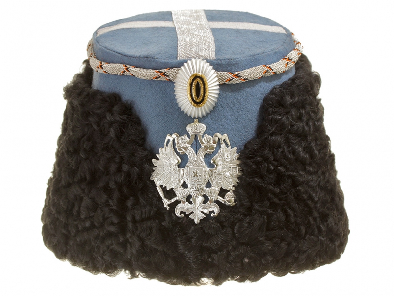 Натуральный каракулевый мех, подбита натуральной кожей, подкладка из муара, в комплекте: государственный герб белый латунный и кокарда малая образца 1881 года.