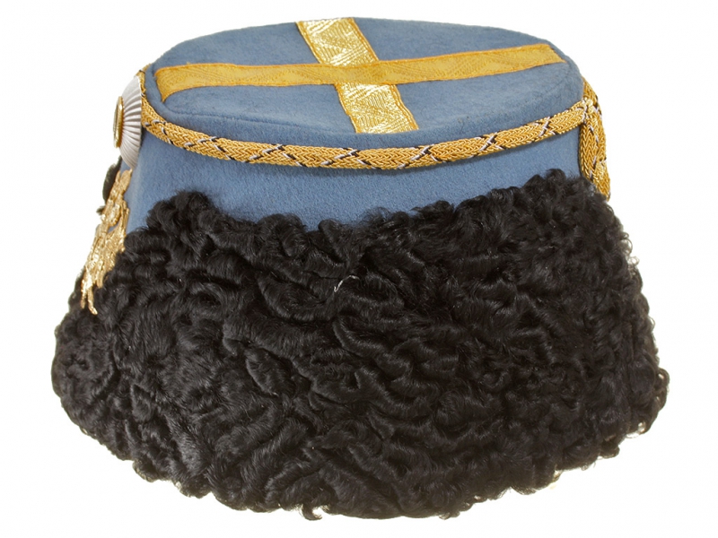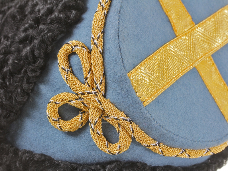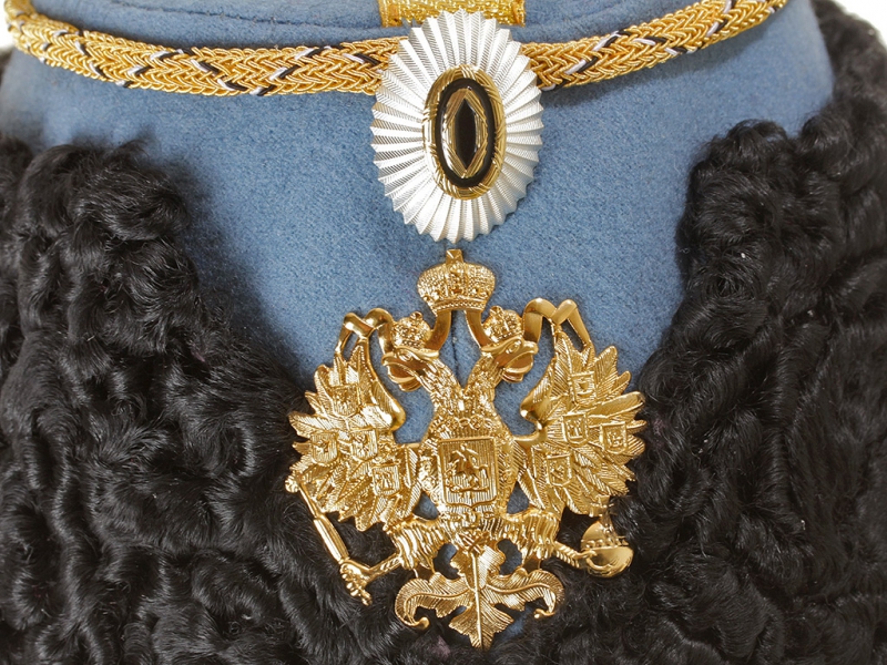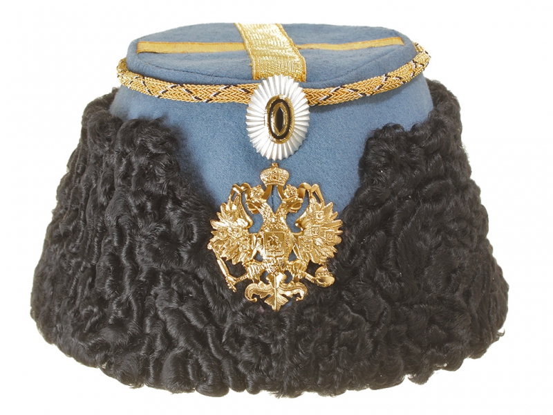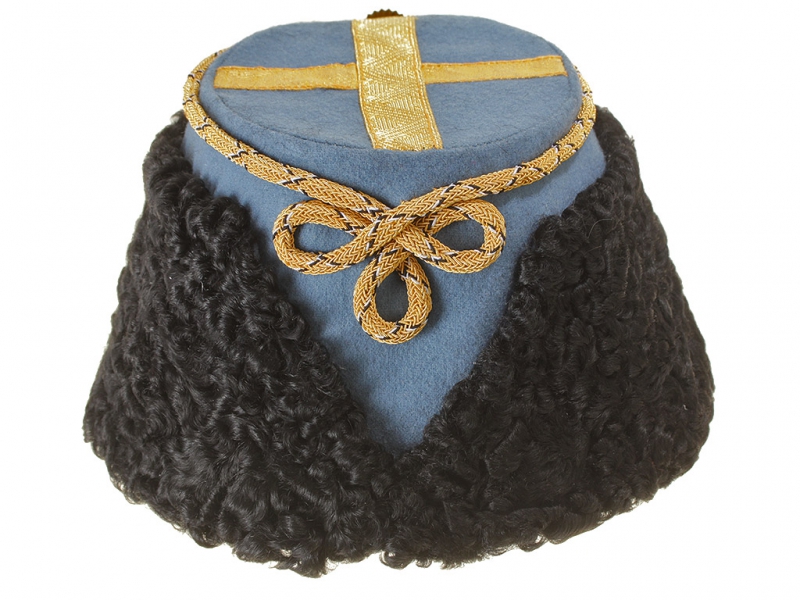 Натуральный каракулевый мех, подбита натуральной кожей, подкладка из муара, в комплекте: государственный герб желтый латунный и кокарда малая образца 1881 года.