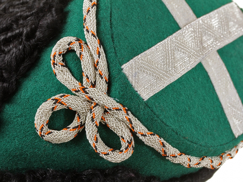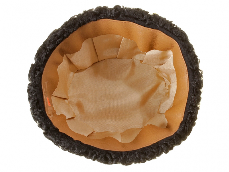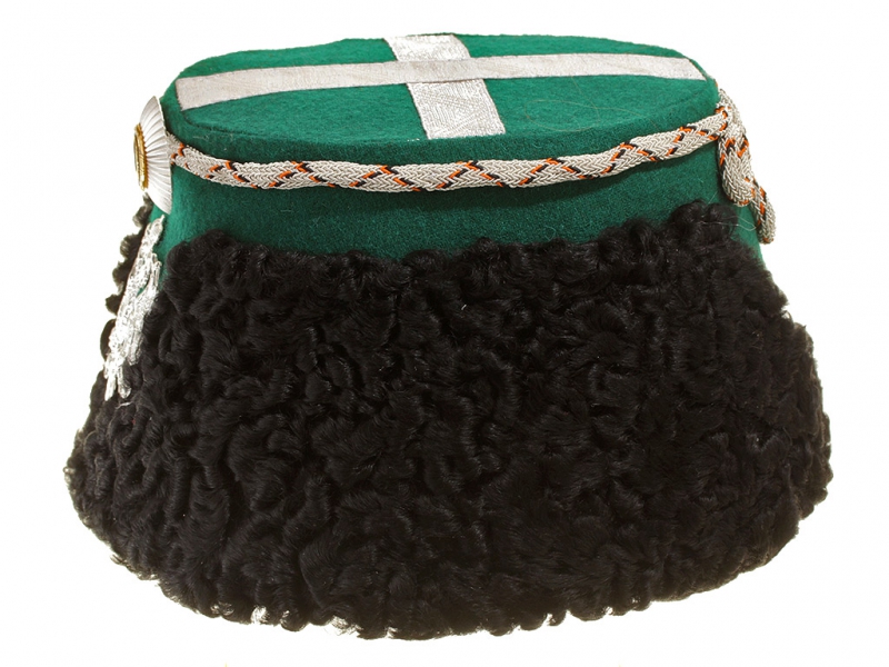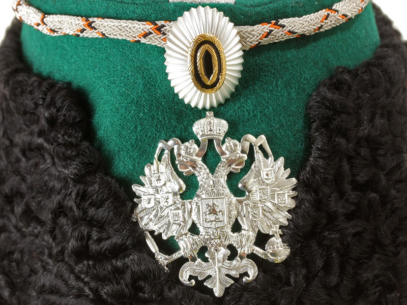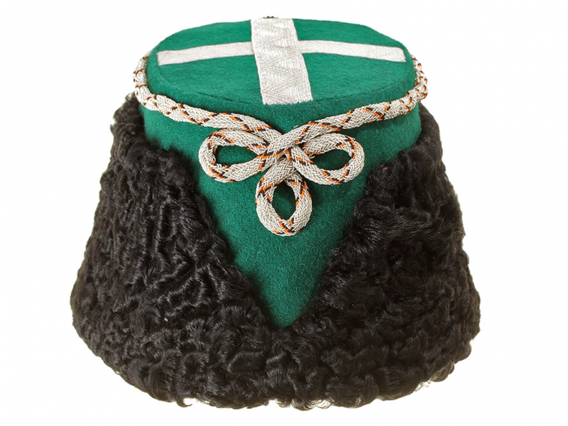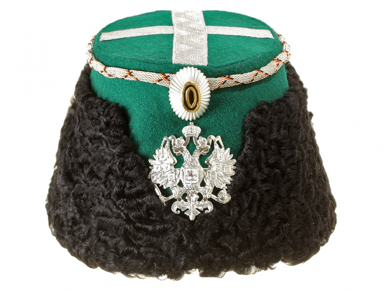 Натуральный каракулевый мех, подбита натуральной кожей, подкладка из муара, в комплекте: государственный герб белый латунный и кокарда малая образца 1881 года.