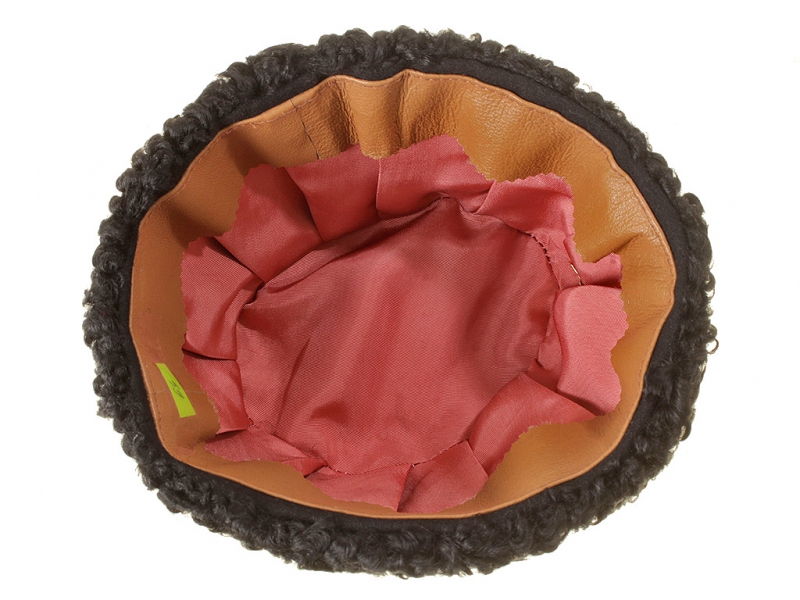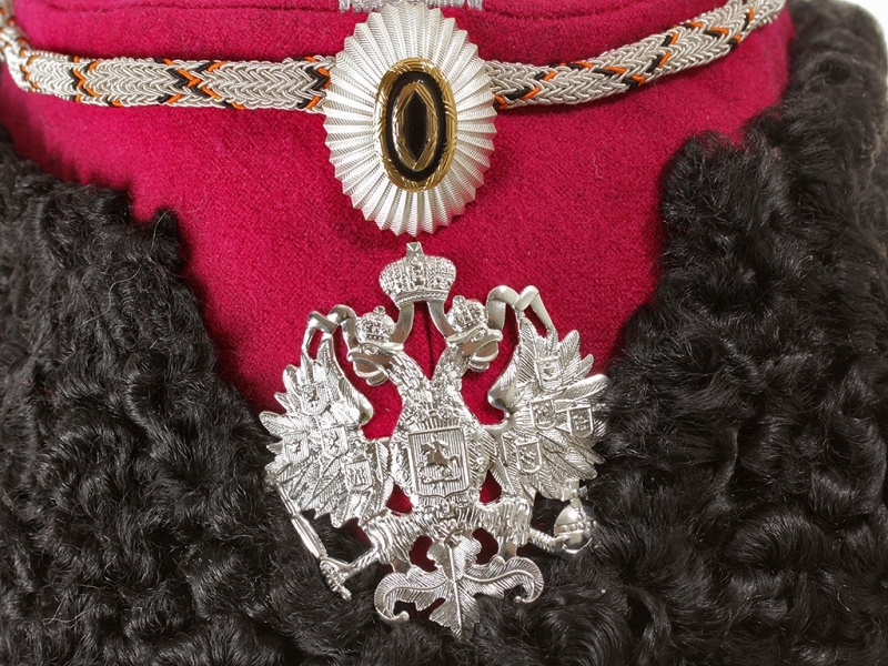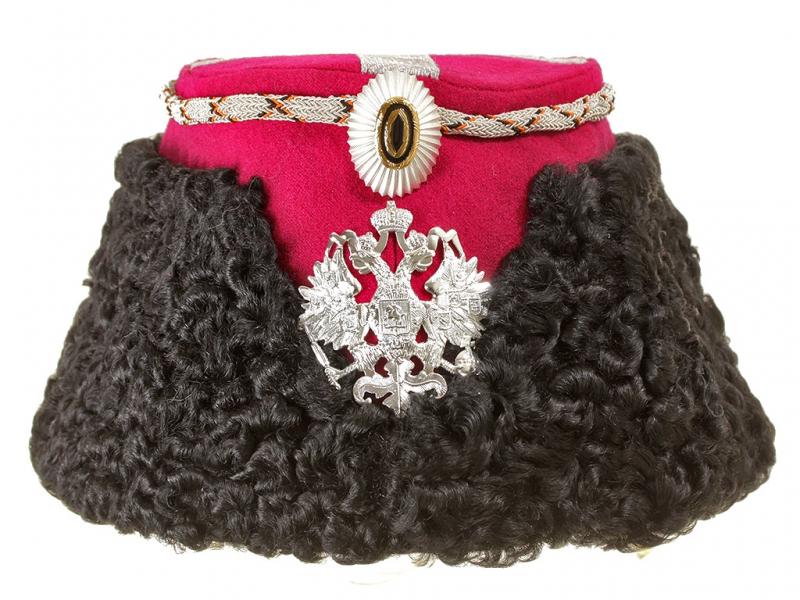 Натуральный каракулевый мех, подбита натуральной кожей, подкладка из муара, в комплекте: государственный герб белый латунный и кокарда малая образца 1881 года.
