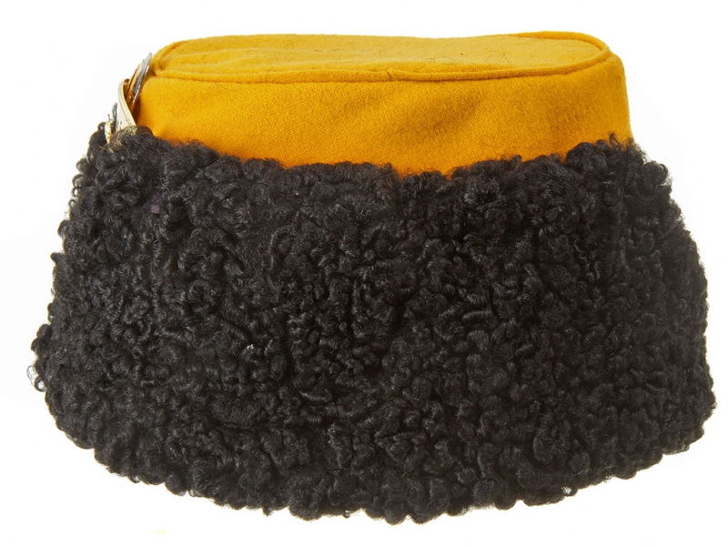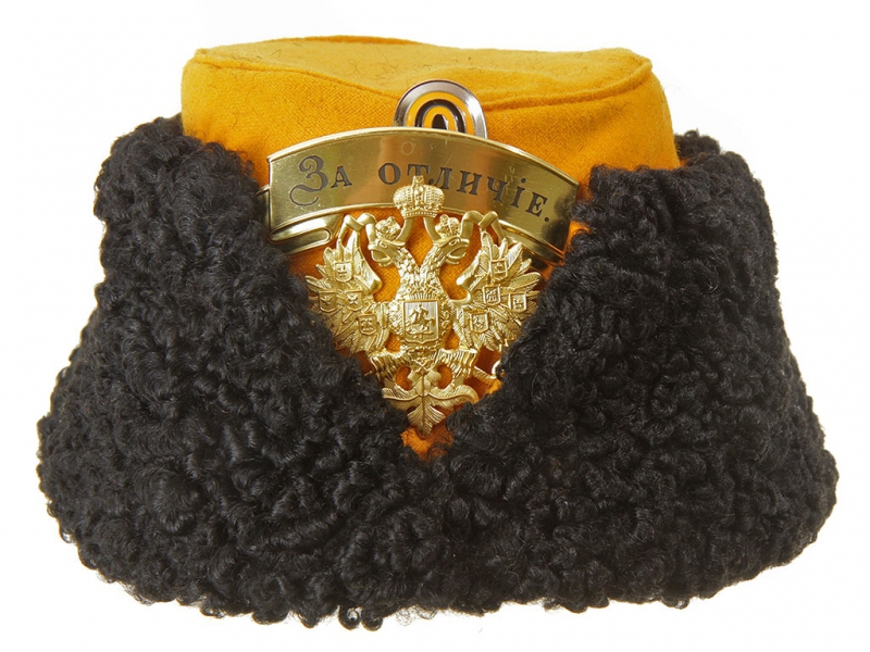 Натуральный каракулевый мех, подбита натуральной кожей, в комплекте: государственный герб желтый латунный и кокарда малая образца 1881 года.