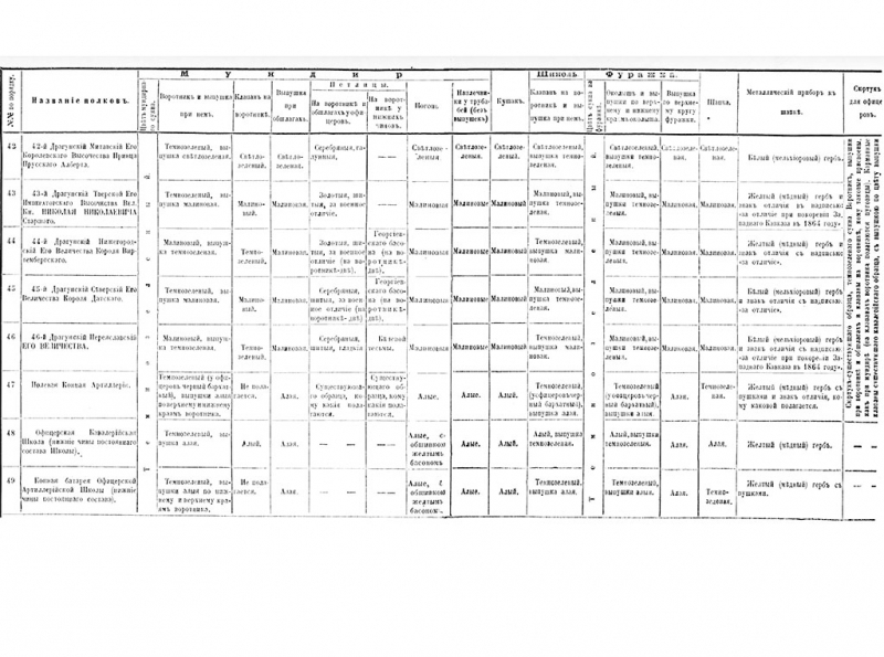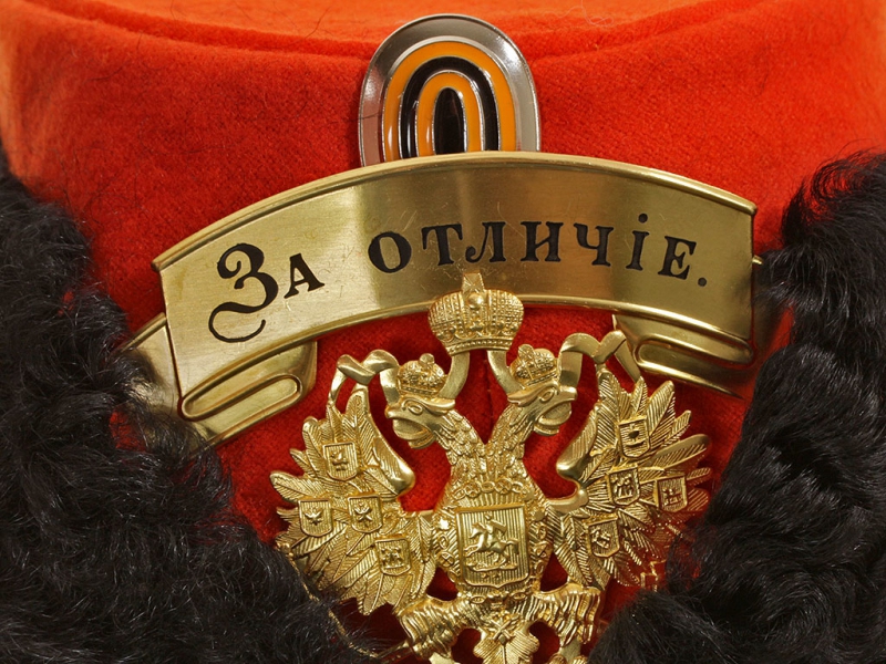 - 5-й Лейб-драгунский Курляндский Его Величества полк. Желтый герб и лента с надписью "За отличие".