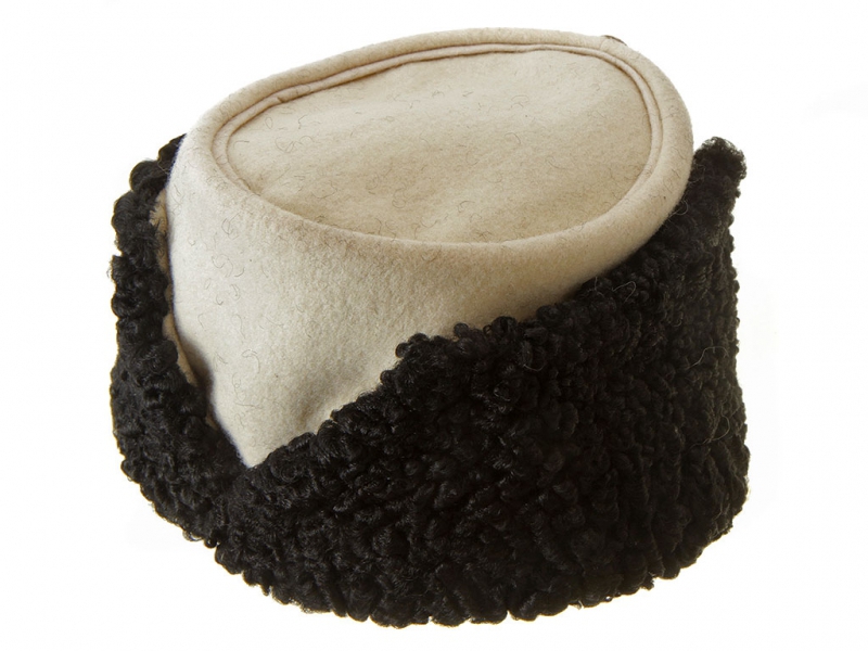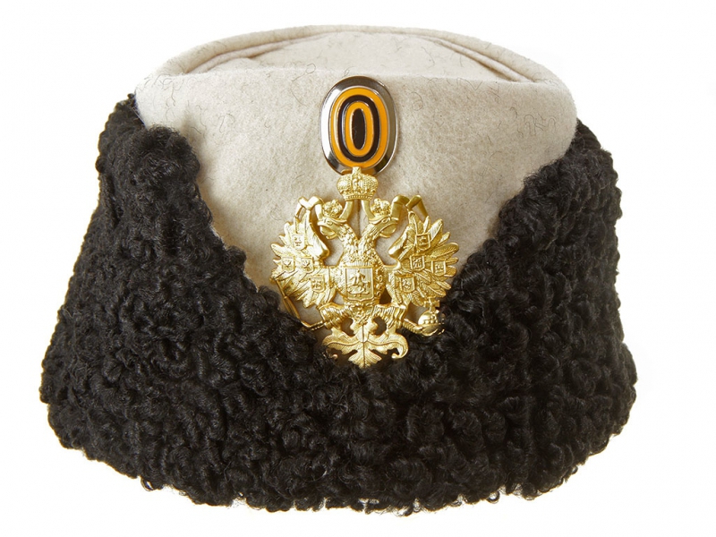 Натуральный каракулевый мех, подбита натуральной кожей, в комплекте: государственный герб желтый латунный и кокарда малая образца 1881 года.