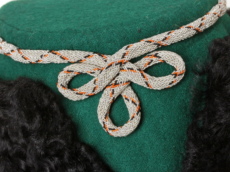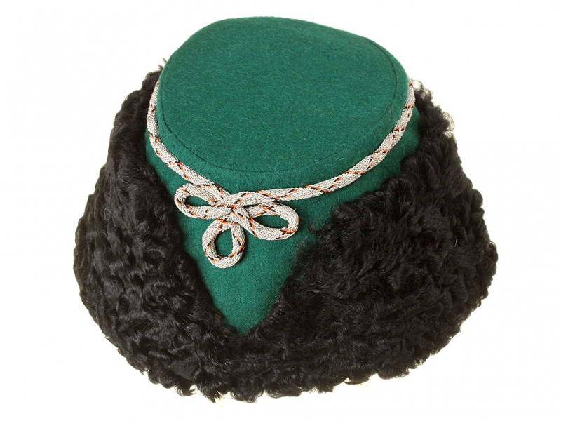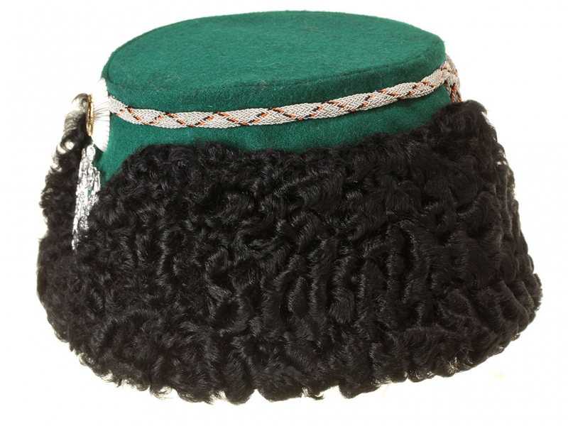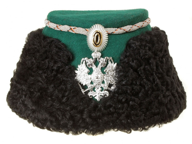 Натуральный каракулевый мех, подбита натуральной кожей, подкладка из муара, в комплекте: государственный герб белый латунный и кокарда малая образца 1881 года.