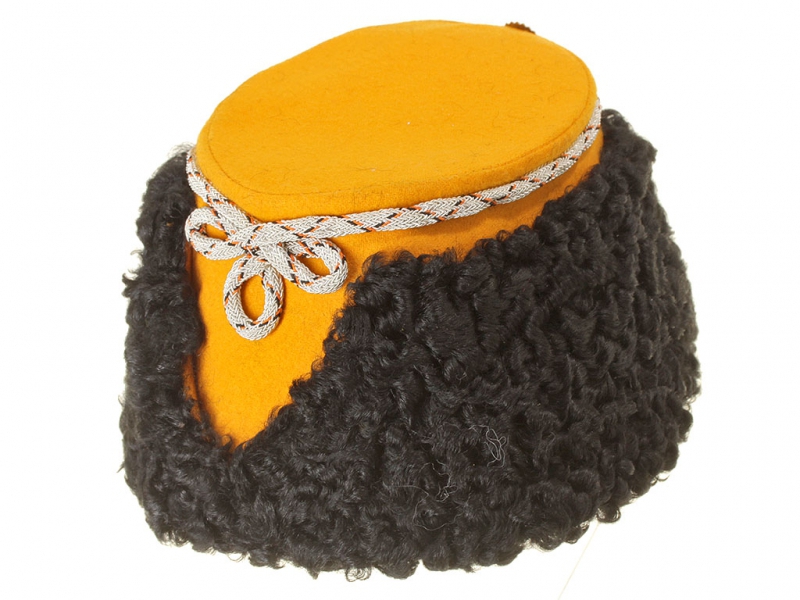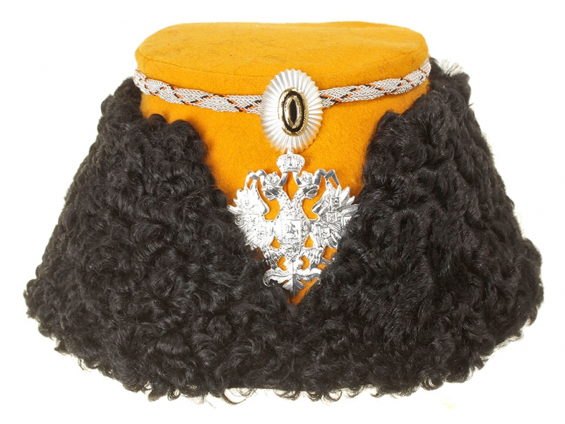 Натуральный каракулевый мех, подбита натуральной кожей, подкладка из муара, в комплекте: государственный герб желтый латунный и кокарда малая образца 1881 года.