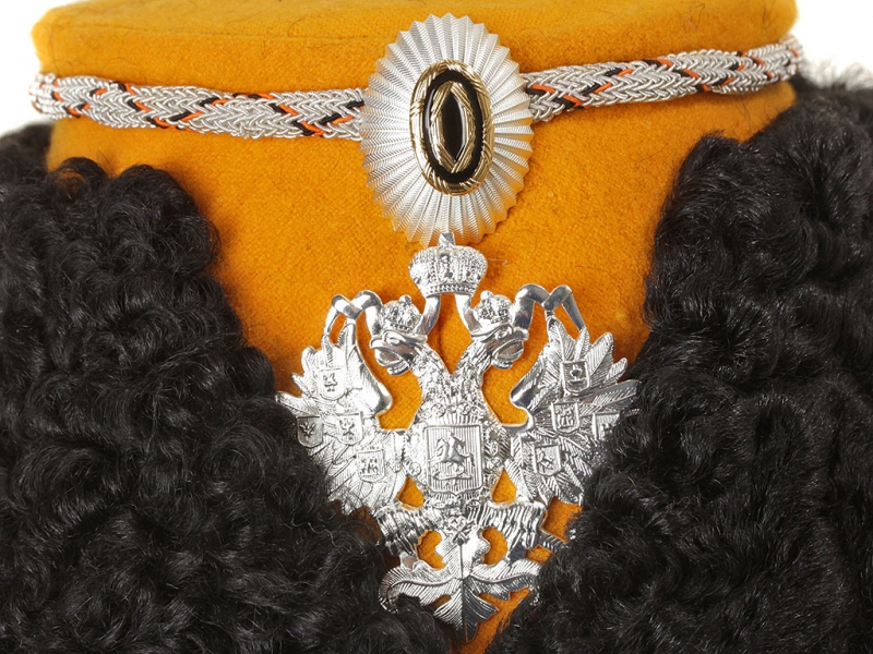 |Шапка барашковая офицерская армейских драгунских полков обр.1882 года. Желтая, белый прибор. Россия, копия