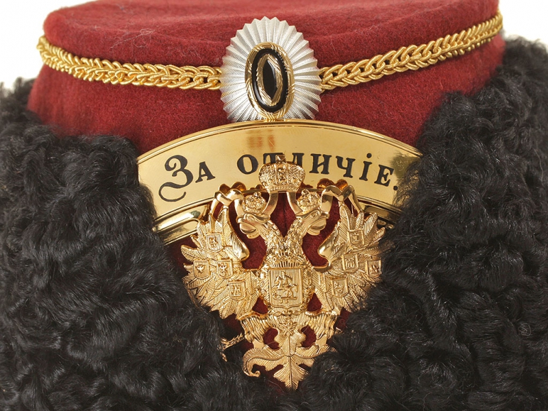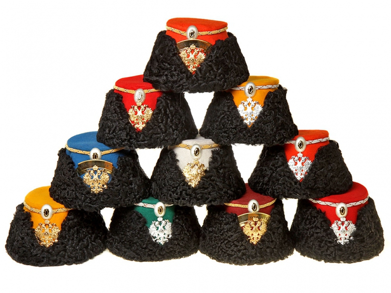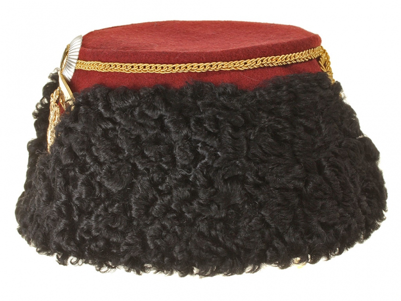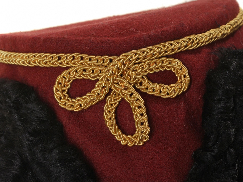 Натуральный каракулевый мех, подбита натуральной кожей, подкладка из муара, в комплекте: государственный герб желтый латунный и кокарда малая образца 1881 года.