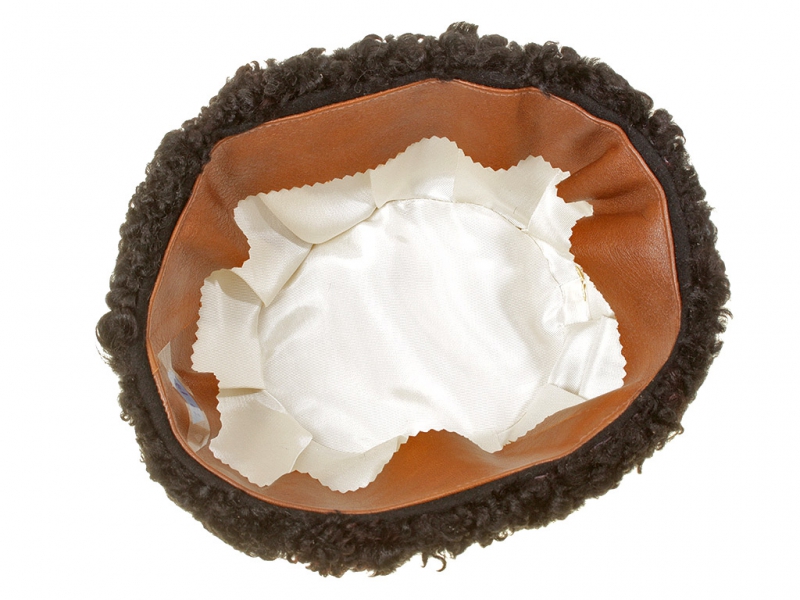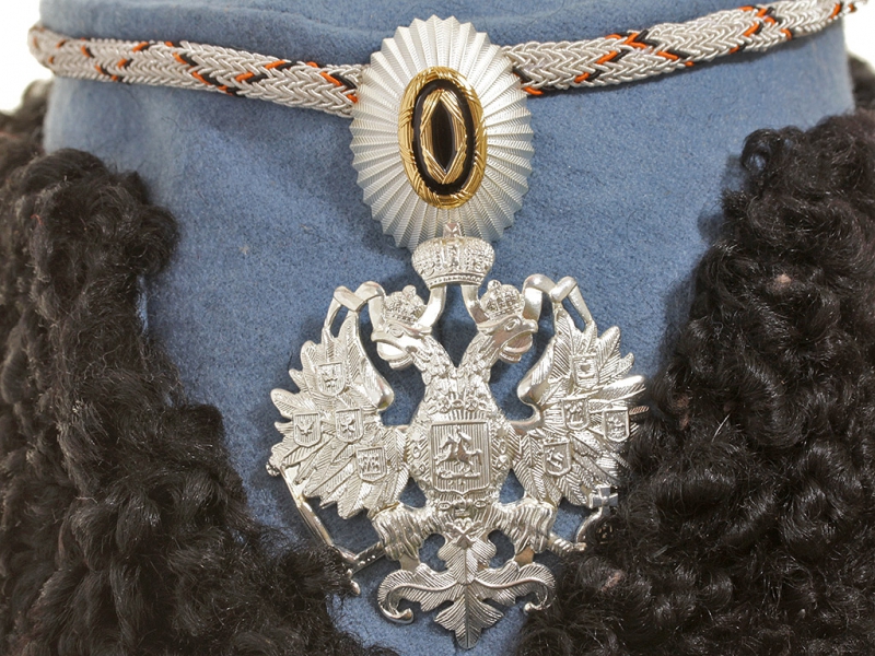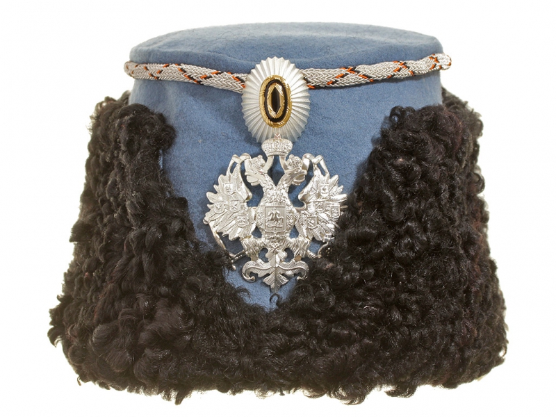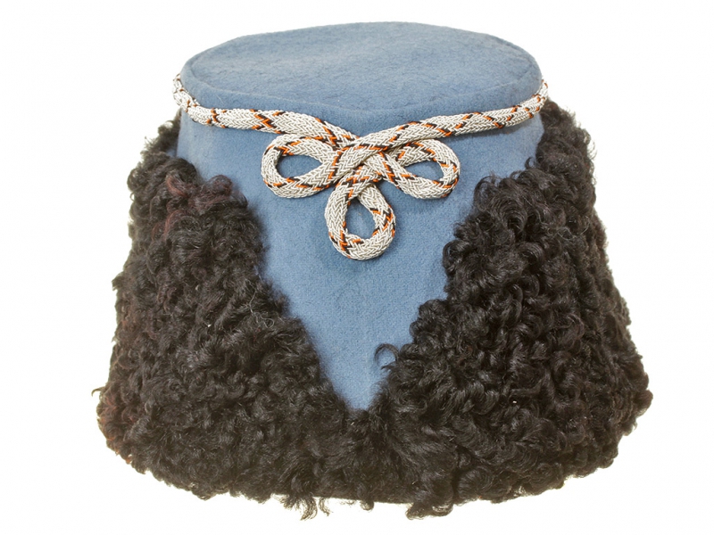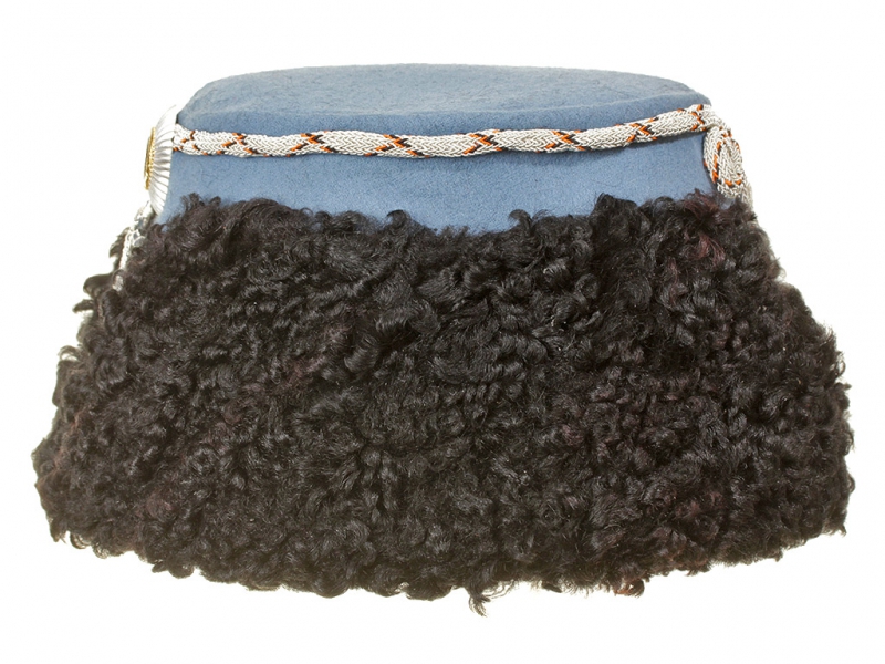Натуральный каракулевый мех, подбита натуральной кожей, подкладка из муара, в комплекте: государственный герб белый латунный и кокарда малая образца 1881 года.