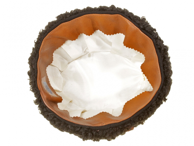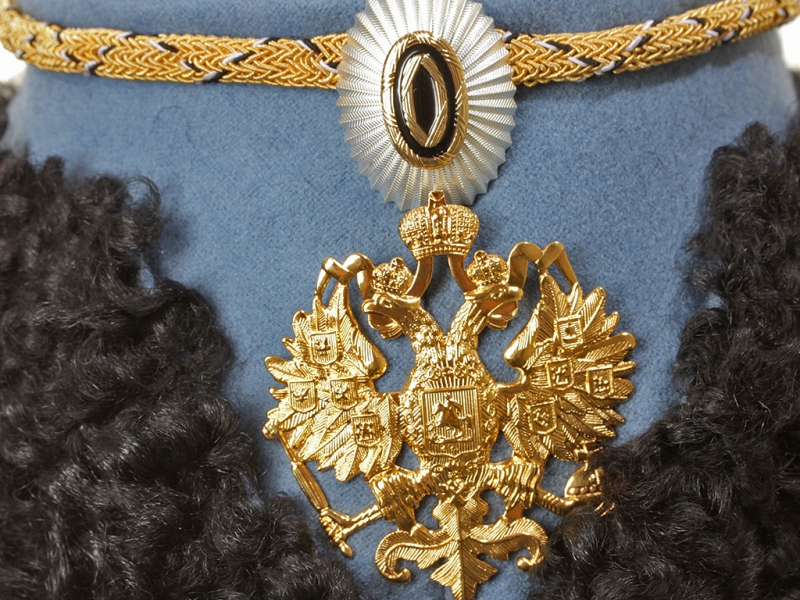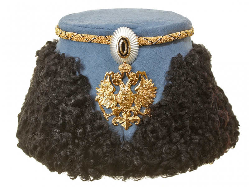 Натуральный каракулевый мех, подбита натуральной кожей, подкладка из муара, в комплекте: государственный герб желтый латунный и кокарда малая образца 1881 года.