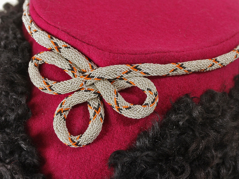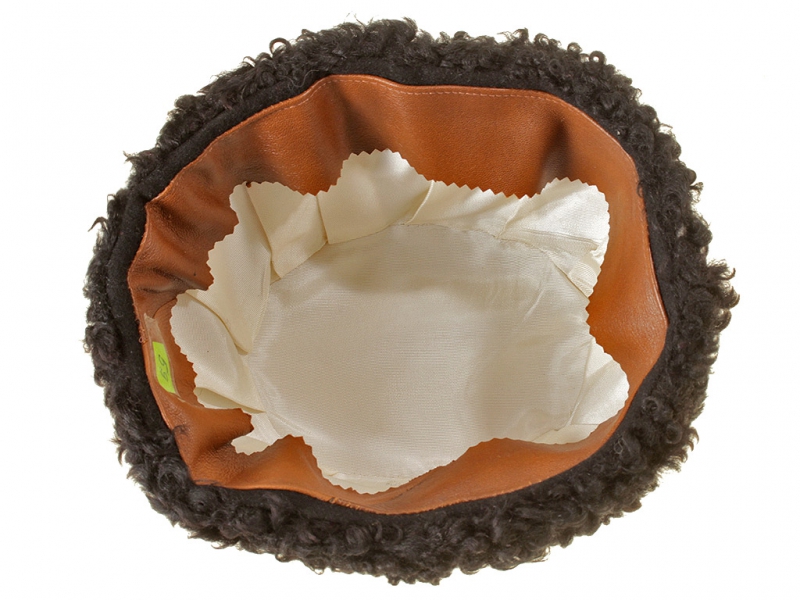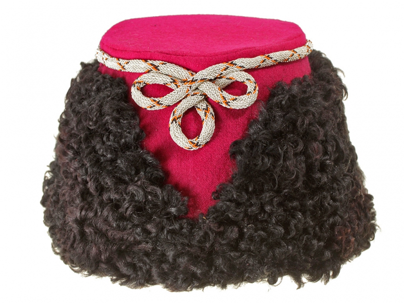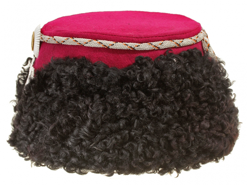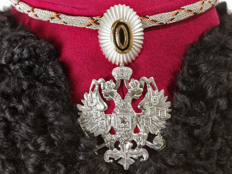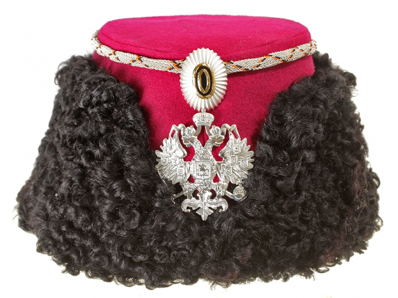 Натуральный каракулевый мех, подбита натуральной кожей, подкладка из муара, в комплекте: государственный герб белый латунный и кокарда малая образца 1881 года.