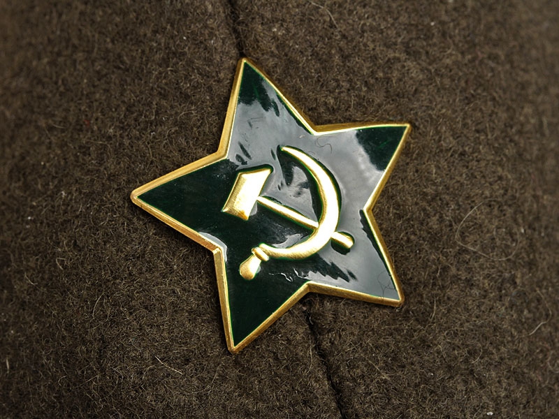 Зелёная эмалевая звездочка образца 1941 года с серпом и молотом на пилотку рядовых и командиров/офицеров Красной Армии времён Великой Отечественной.