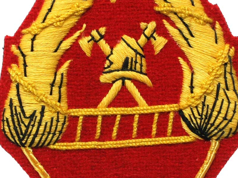 Красное поле, желтое шитье, 1 вышитый угол в нижнем треугольнике - доброволец в звании старшего пожарного.