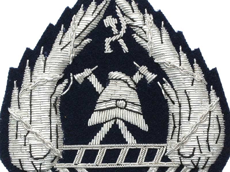 Синее поле, шитье серебром, 4 угла в нижнем треугольнике - инспектор (помощник главного инспектора) по делам пожарной охраны.
