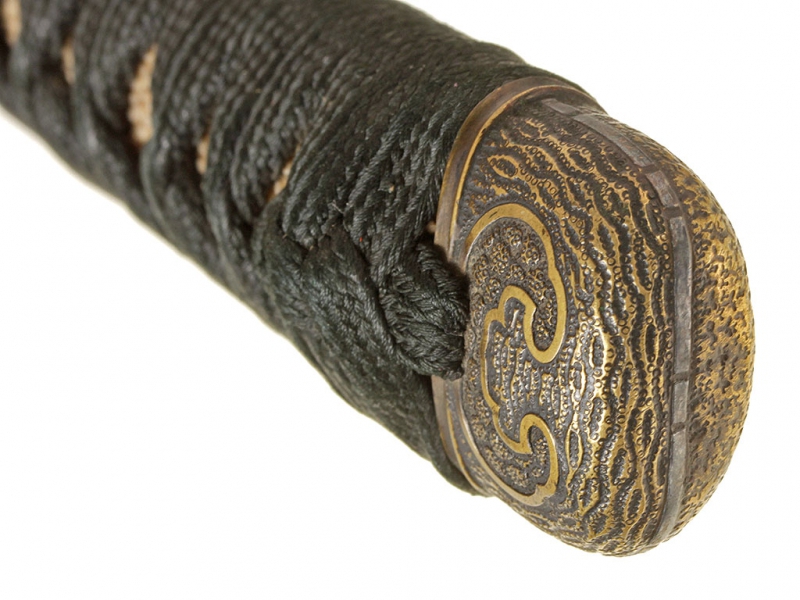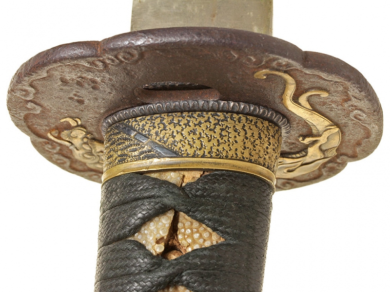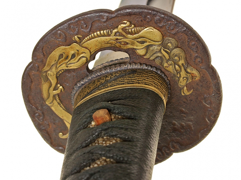 Клинок стальной, изогнутый, ручной ковки, без долов в идеальной японской полировке. Четко просматривается линия закалки «якиба»  с узором «хамон».  Хвостовик – «накаго»  с  отверстием для крепления и подписью автора. «Цуба» стальная, формы «мокко», украшена изображением дракона. Рукоять –«цука» образована двумя склеенными между собой деревянными частями, покрытыми шкурой белого ската – «самэ». Рукоять в сечении овальная, сквозное отверстие обеспечивает фиксацию с мечом посредством крепежа – «мекуги». Рукоять обмотана шелковым шнуром «ито» коричневого цвета. С обеих сторон "цука" размещены рельефные накладки «менуки». Рукоять увенчана навершием «кассира» и муфтой «фути». Ножны «сая» выполнены из дерева, покрыты черным лаком «уруси» и украшена изображениями стрекоз. На верхней части «сая» расположен выступ «куригата», сквозь который продет шелковый синий шнур «сагео». Все элементы оправы выполнены в эпоху Эдо(1603—1868).