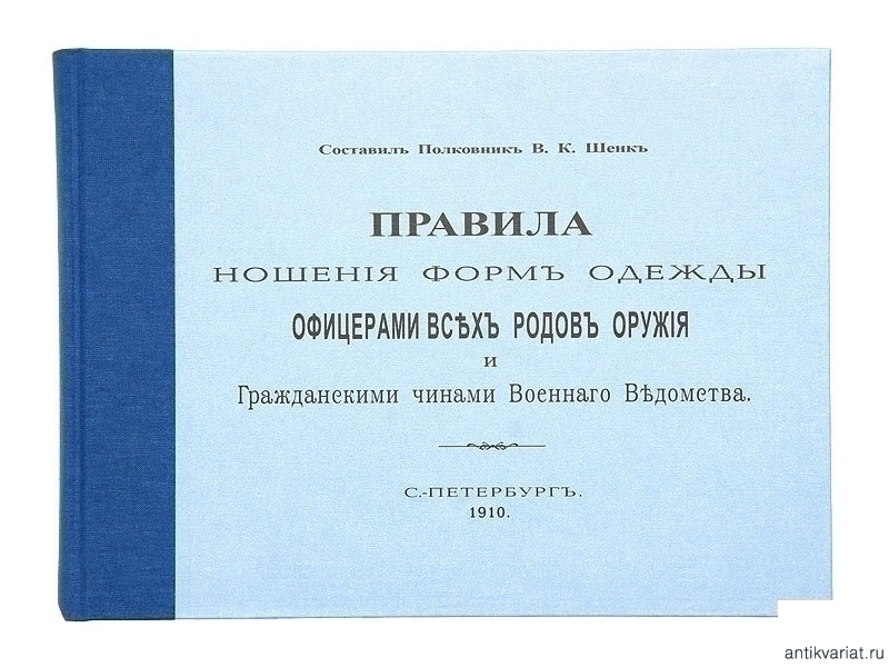 Репринтное издание "Правил.." В.К. Шенка 1910г. является базовым, наиболее законченным по подбору и исполнению сводом постановлений относительно правил ношения военной формы одежды в России 1910-х гг, на который опирались все последующие издания.Вплоть до 1917 г. в правила ношения военной формы вносились дополнения и изменения, но повторно такого полного собрания руководящих документов больше не создавалось. "Правила..." 1910 г. сохраняли свою актуальность даже при Советской власти.