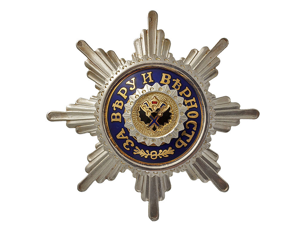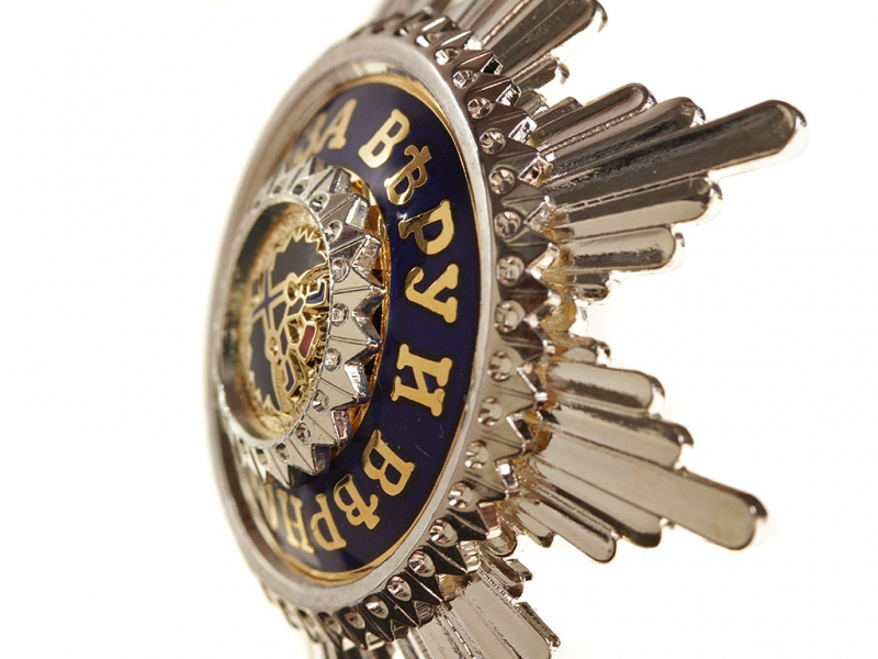 Копия очень высокого качества, состоит из пяти отдельных элементов, сделанных штампами. Натуральное серебрение и золочение, серебрение со временем покрывается красивой патиной (как в оригинале). Звезда крепится к головному убору на две пары кляммеров (усов).