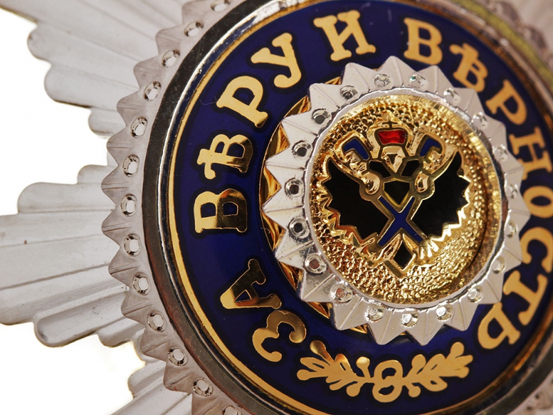 Гвардейская Звезда Ордена Андрея Первозванного - эмблема на головной убор (кокарда) Гвардии на период правления Александра III - Николая II. При изготовлении в качестве образца использована подлинная звезда, копия внешне практически полностью повторяет оригинал. Необходимо отметить, что в гвардейских полках служили представители знатнейших (и богатейших) дворянских фамилий России. Офицеры гвардии зачастую тратили огромные, в сравнении с офицерами армейских полков, суммы на пошив униформы и покупку снаряжения; большинство элементов экипировки делалось на заказ. Аналогичные представленной Андреевские звезды являлись, как и полковые знаки, настоящими произведениями ювелирного искусства: они делались из серебра 84 пробы, накладные элементы - из золота, тщательность отделки и качество эмали также позволяли сравнить кокарду не с элементом униформы, а с ювелирным изделием.