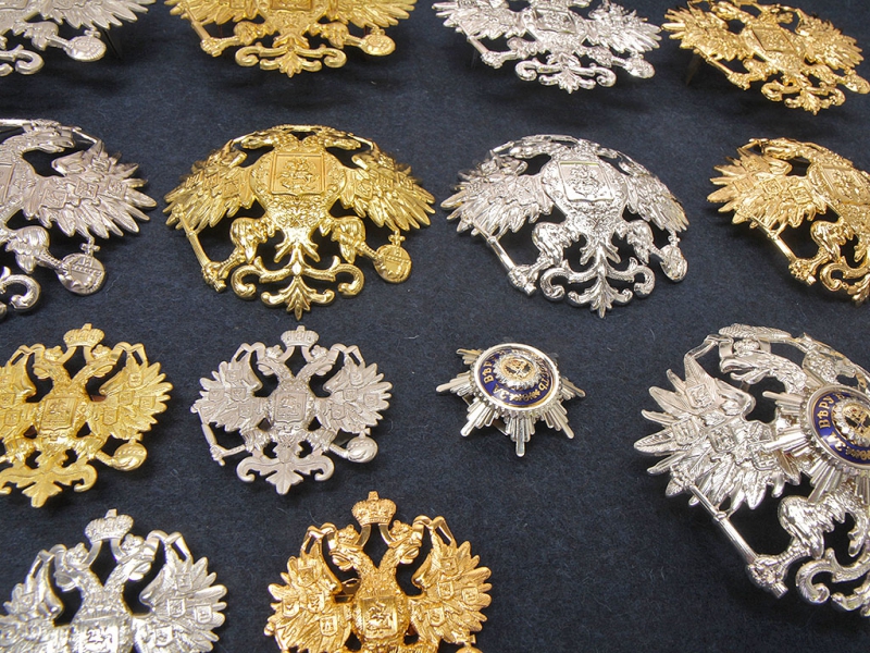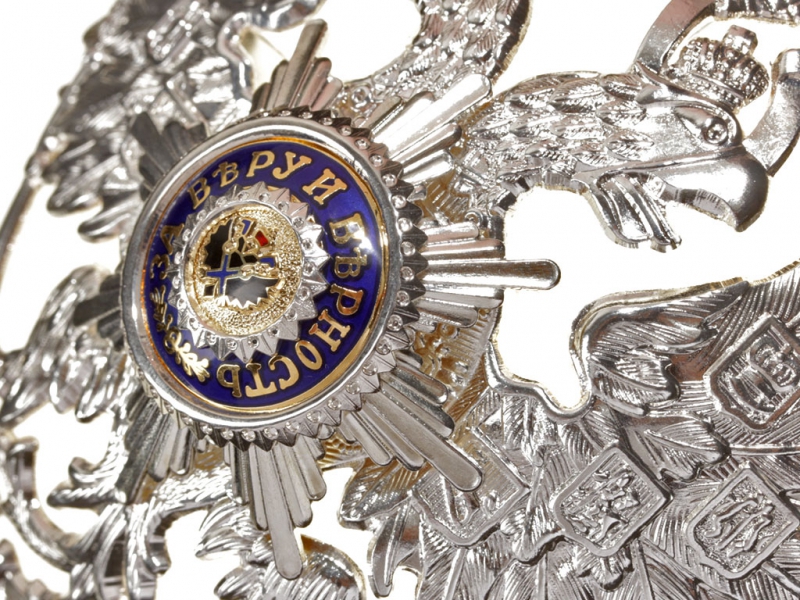 Спереди на шапках государственный герб цвета приборного металла, присвоенного полку (золотистый или серебристый). Над гербом в полках №№ 1,2,3,4,7,8,9,10,12,13 металлический знак отличия по прибору.