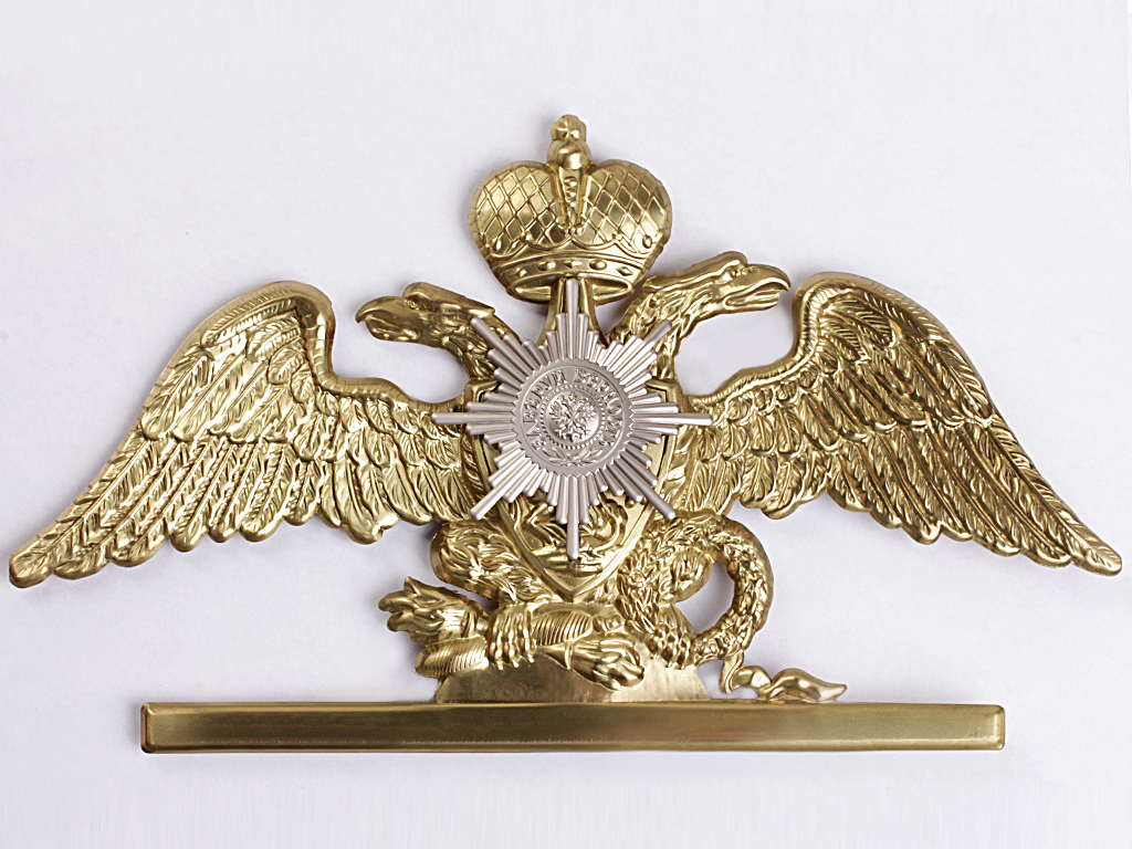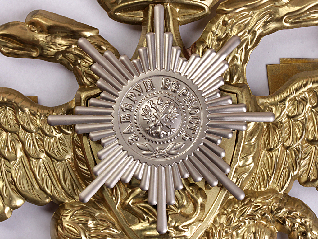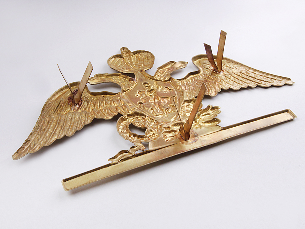 Латунный штампованный орел, совмещенный с Андреевской звездой, на головной убор (кивер) нижних чинов постоянного состава Офицерской стрелковой школы в Ораниенбауме. Офицерская стрелковая школа (ОСШ) - военно-учебное заведение Русской армии, предназначенное для повышения квалификации пехотных офицеров и подготовки их к занятию строевых командных должностей, действовавшее в 1826 - 1917 годах.