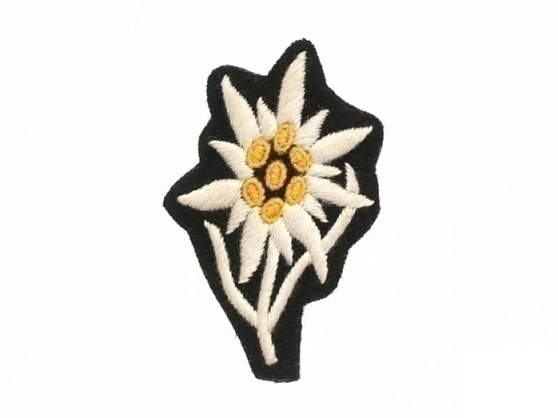 Нашивка на кепку - "эдельвейс" для горнострелковых частей войск СС (солдатская). Машинная вышивка на черной суконной основе.