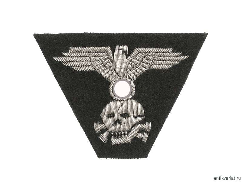 Шитая серебряной металлизированной нить на черном суконном фоне трапециевидная кокарда на головной убор офицера войск СС (Waffen-SS).