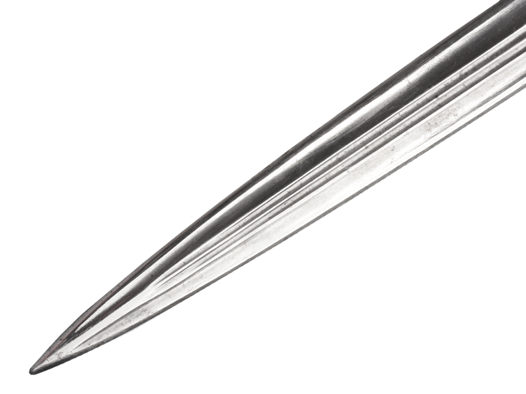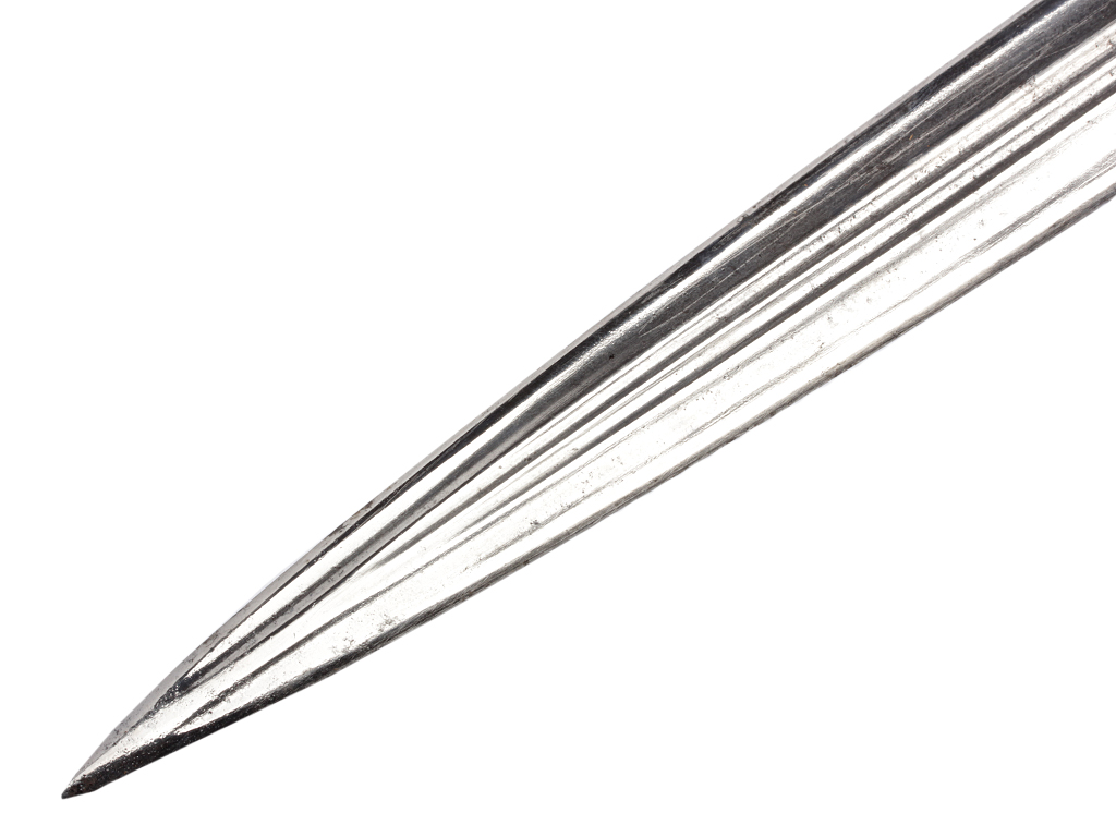 Клинок прямой, обоюдоострый, с двумя узкими и двумя широкими долами. У основания клинка с внутренней стороны в орнаментальном картуше нанесена травлением монограмма "ЗОФ" (Златоустовская оружейная фабрика) с годом выпуска - 1908; с лицевой стороны в аналогичном картуше - монограмма "ККВ" (Кубанское казачье войско).