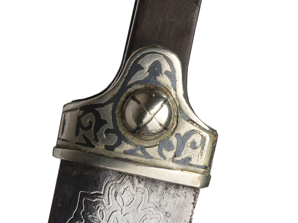 Рукоять образована двумя роговыми накладками, муфта и заклепки украшены гравировкой и черневым уставным орнаментом. На внутренней стороне рукояти - три зарубки, нанесенные владельцем.