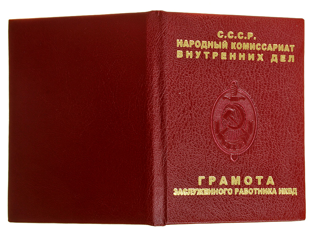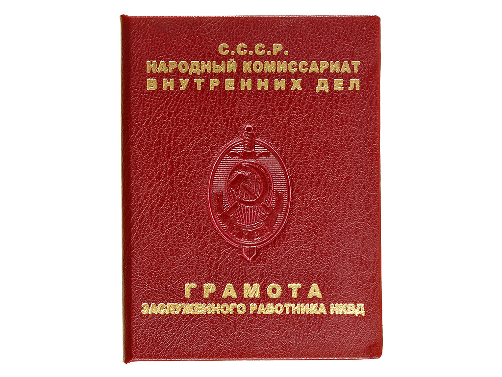 Грамота к нагрудному знаку "Заслуженный работник НКВД" - образец Грамоты, утвержденный после разделения Наркомата на собственно НКВД (Народный Комиссариат Внутренних Дел) и НКГБ (Народный Комиссариат Государственной Безопасности). Представленная Грамота предназначалась для награждения отличившихся сотрудников по Наркомату Госбезопасности.