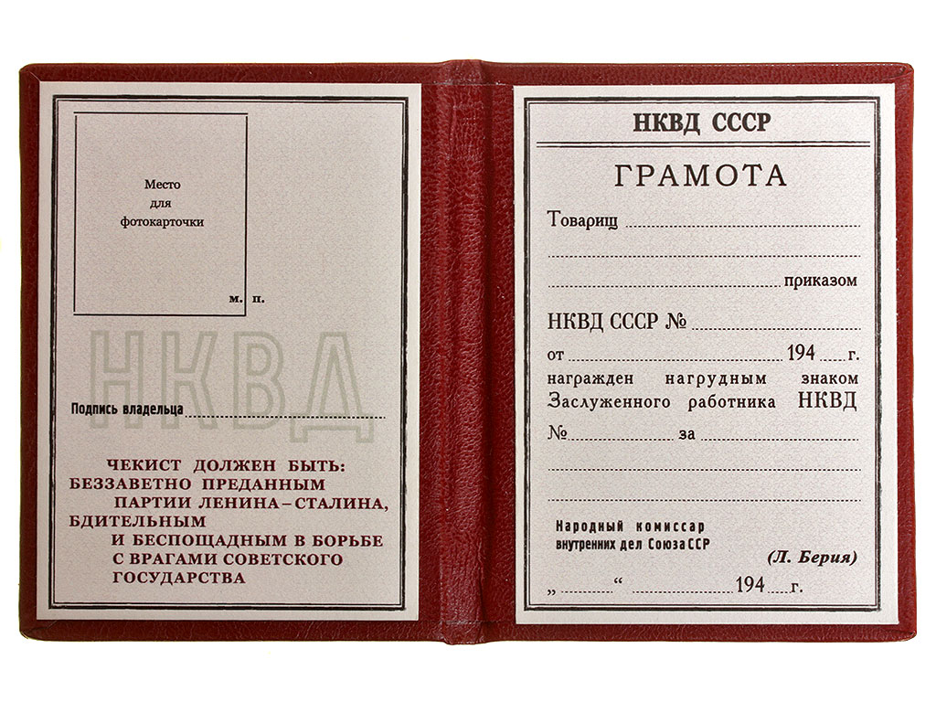 | Грамота НКВД к нагрудному знаку "Заслуженный работник НКВД", СССР. Копия