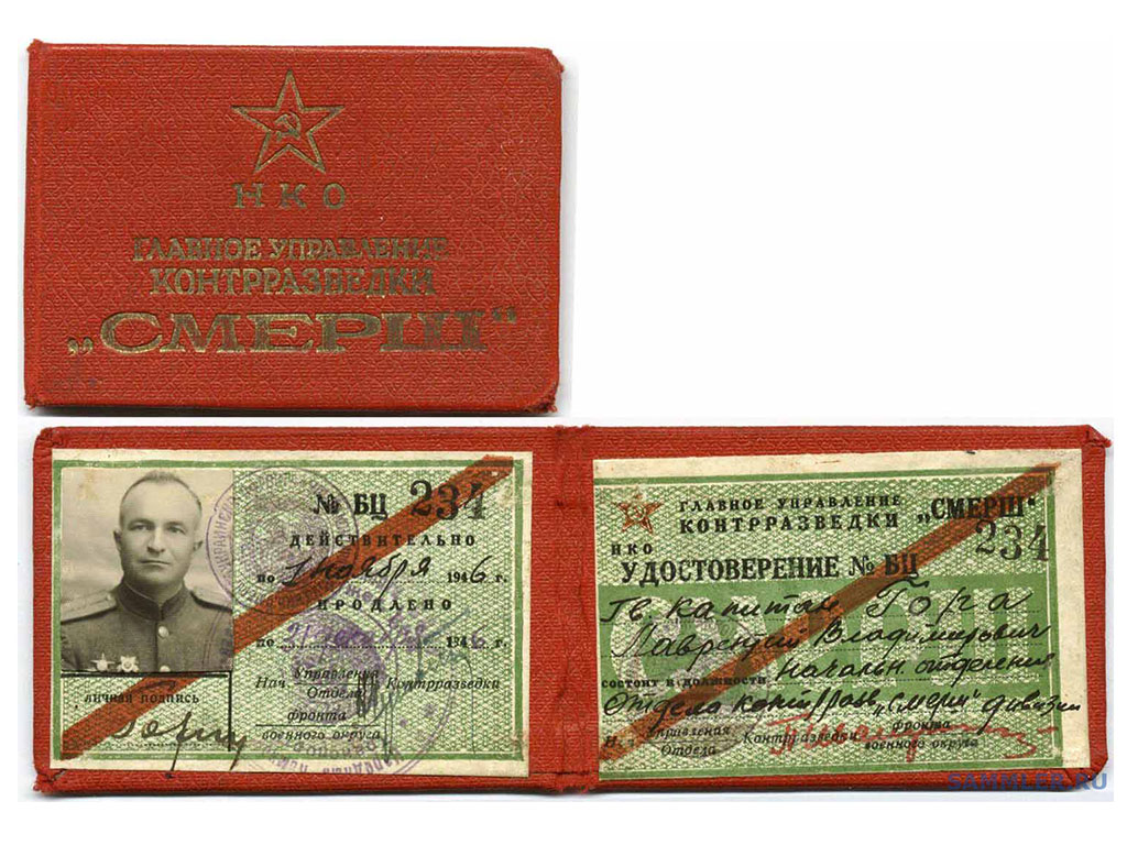 Удостоверение Главного управления (ГУ) контрразведки СМЕРШ Народного Комиссариата Обороны (НКО) СССР.