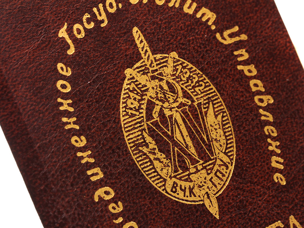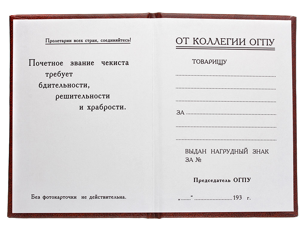 Высокого качества копия Грамоты к наградному ведомственному знаку "15 лет ВЧК - ГПУ" (Почетный работник ВЧК - ГПУ). Представляет собой коленкоровую корочку с тисненым золотом изображением знака на обложке в обрамлении надписи "Об'единенное Госуд. Полит. Управление". На развороте слева - место для фотографии награжденного (без фото грамота была недействительна), справа вписывались фамилия, имя и отчество кавалера, а также указывался номер нагрудного знака.
