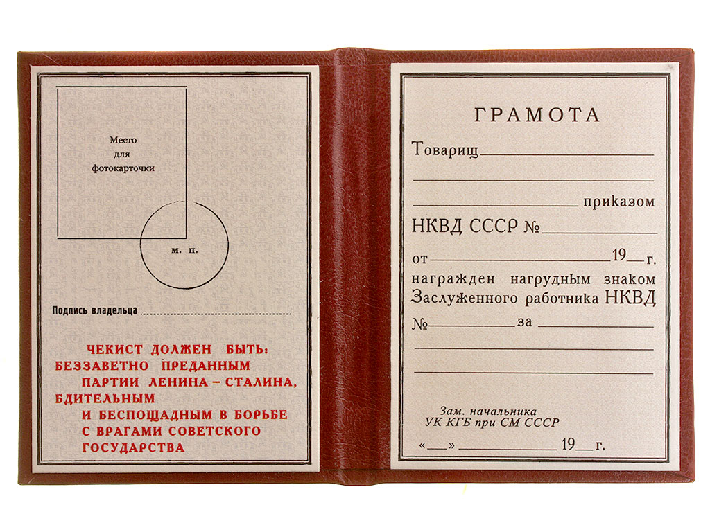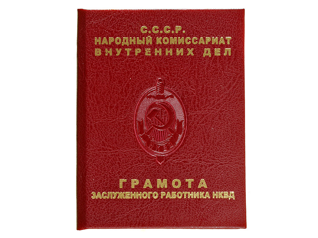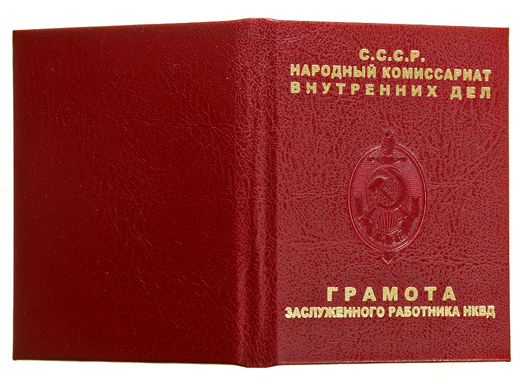 Грамота к нагрудному знаку "Заслуженный работник НКВД" - образец Грамоты, утвержденный после разделения Наркомата на собственно НКВД (Народный Комиссариат Внутренних Дел) и НКГБ (Народный Комиссариат Государственной Безопасности). Представленная Грамота предназначалась для награждения отличившихся сотрудников по Наркомату Госбезопасности.