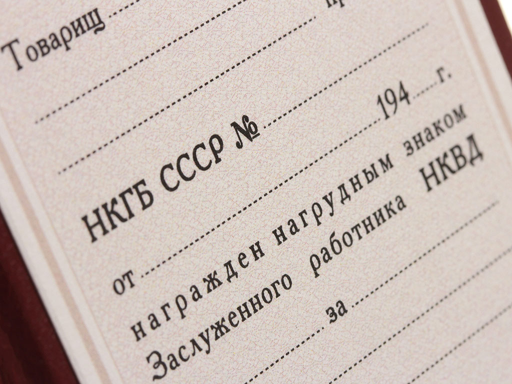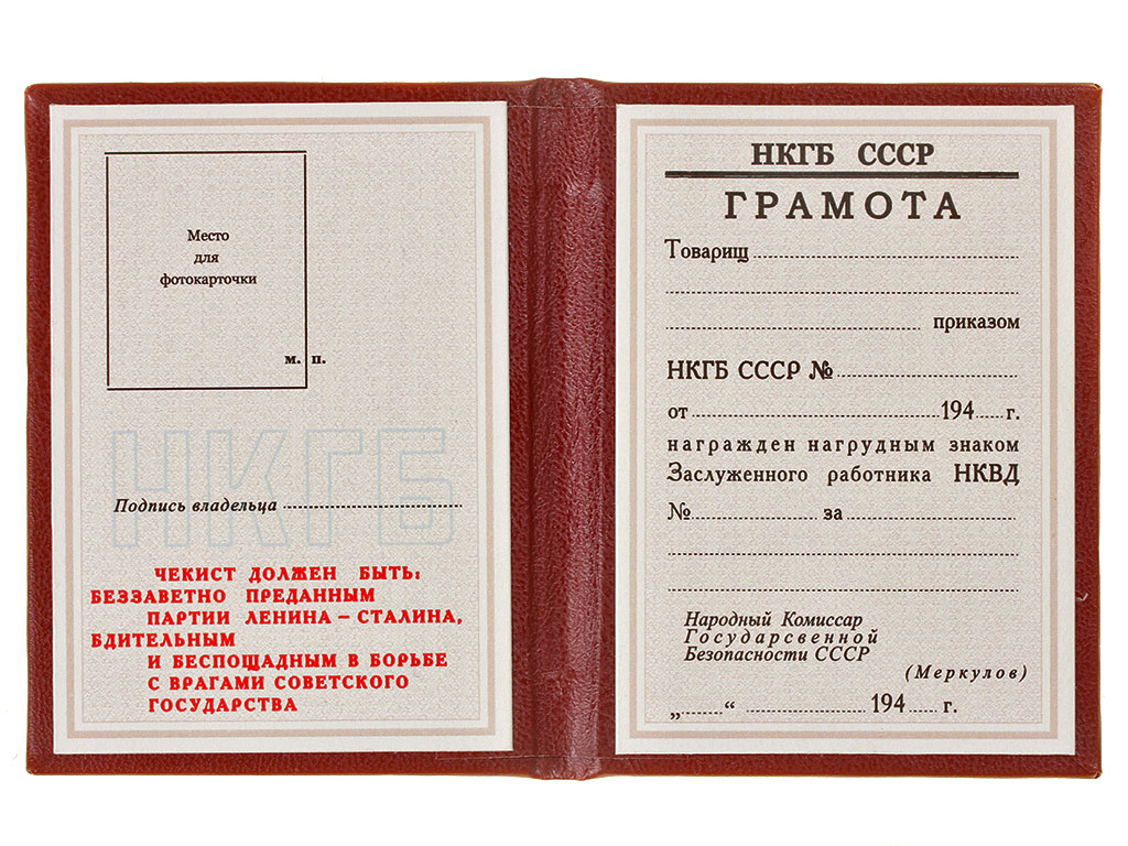 | Грамота НКГБ к нагрудному знаку "Заслуженный работник НКВД", СССР. Копия