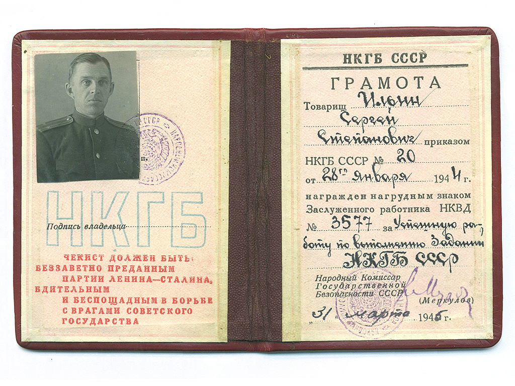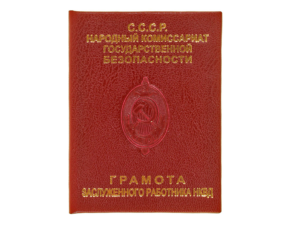 Грамота к нагрудному знаку "Заслуженный работник НКВД" - образец Грамоты, утвержденный после разделения Наркомата на собственно НКВД (Народный Комиссариат Внутренних Дел) и НКГБ (Народный Комиссариат Государственной Безопасности). Представленная Грамота предназначалась для награждения отличившихся сотрудников по Наркомату Госбезопасности.