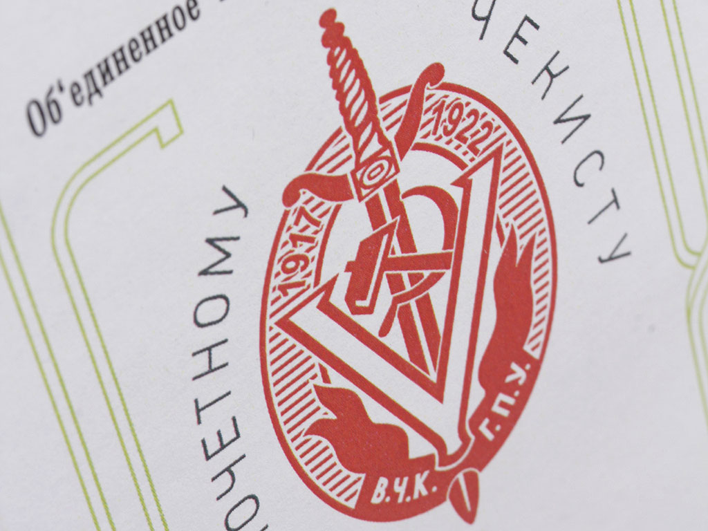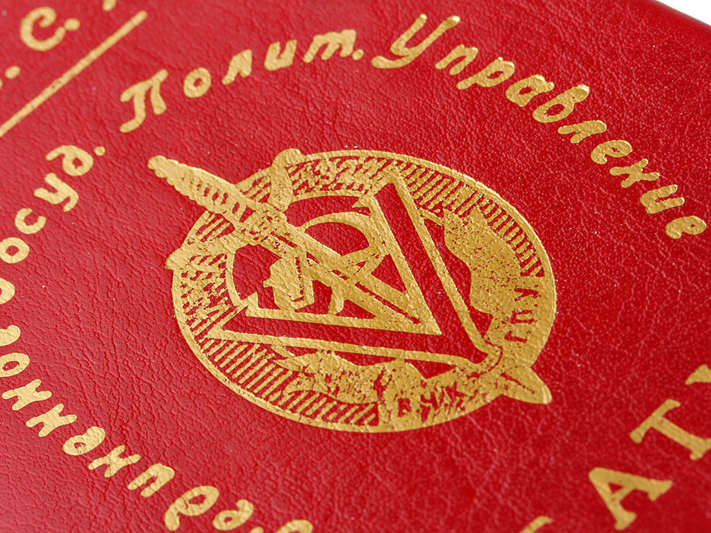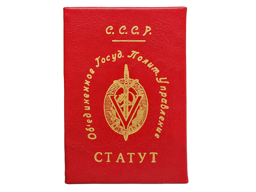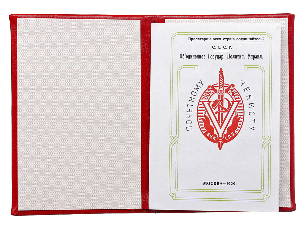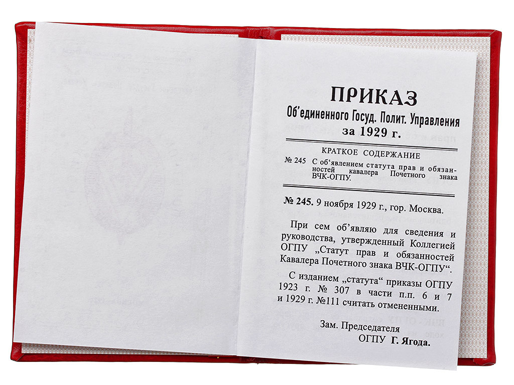 Высокого качества копия Статута к наградному ведомственному знаку "5 лет ВЧК - ГПУ" (Почетный работник ВЧК - ГПУ). Представляет собой коленкоровую корочку с золотым изображением знака на обложке в обрамлении надписи "Об'единенное Госуд. Полит. Управление" (ОГПУ - Объединенное Государственное Политическое Управление). На развороте справа - также изображение знака с надписью вокруг "Почетному чекисту". Статут содержит в себе Приказ ОГПУ №245 за 1929 год за подписью заместителя председателя ОГПУ Генриха Ягоды, разъясняющий права и обязанности награжденного, с перечислением привилегий, данных кавалеру этой высокой ведомственной награды.
