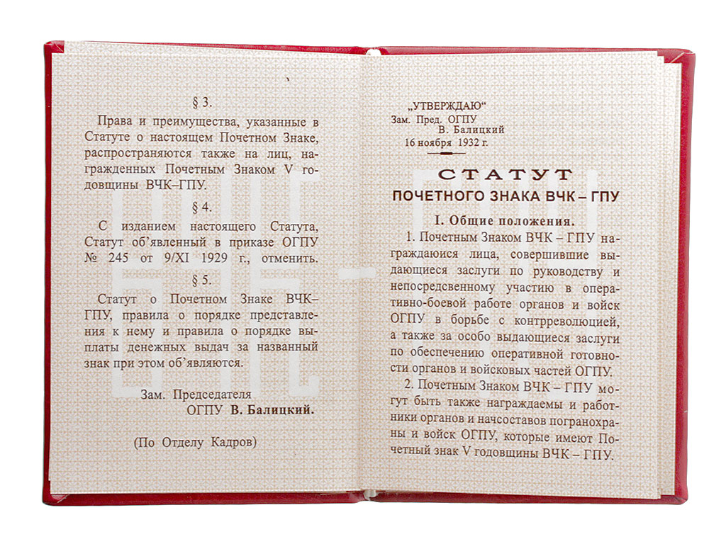 Представляет собой красную коленкоровую корочку с тисненым золотом изображением знака на обложке в обрамлении надписи "Об'единенное Госуд. Полит. Управление". Статут вручался награжденному вместе со знаком и Грамотой. Внутри содержались Приказ об утверждении Почетного Знака ВЧК - ОГПУ и общие положения, регламентировавшие права и льготы награжденных данным знаком.