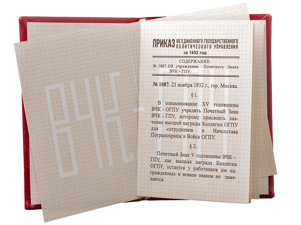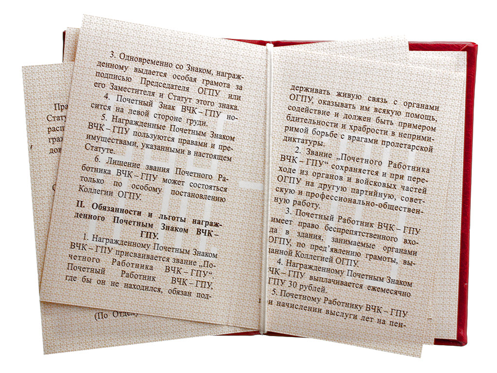 Все это скреплялось подписью председателя ОГПУ (Наркома внутренних дел). Выгравированный на реверсе знака номер должен был соответствовать указанному в грамоте.