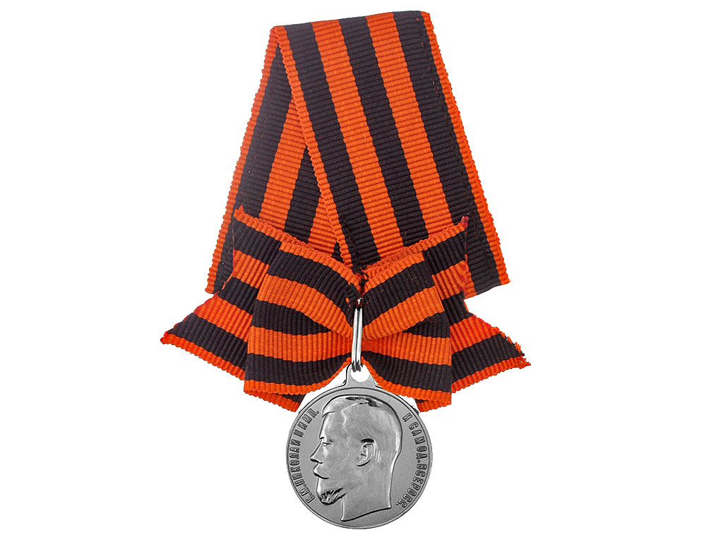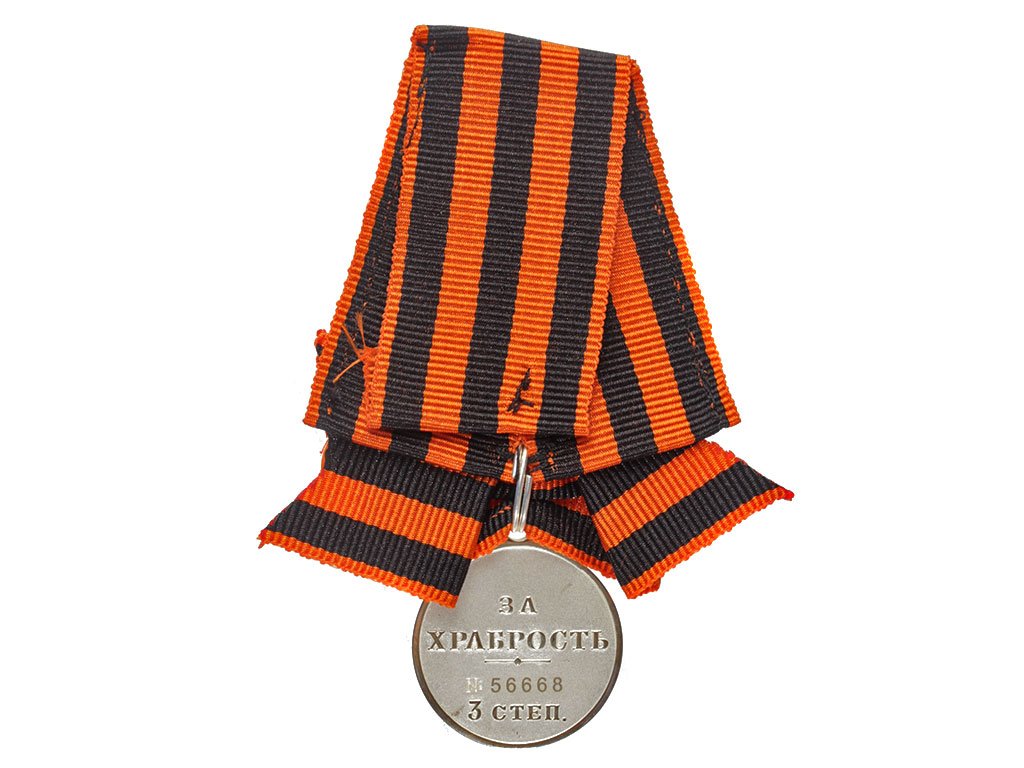 Георгиевская серебряная медаль «За храбрость» 3-й ст. От 4-й степени отличается наличием банта на колодке (также степень медали указана на реверсе).