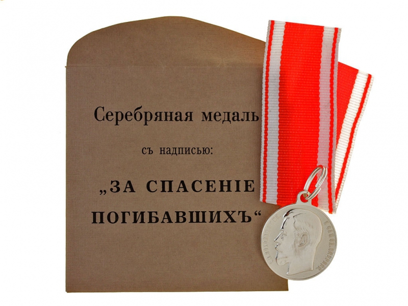 Медалью награждали «за подвиги человеколюбия, с опасностью собственной жизни совершенные, но не подходящие под действие орденских статутов». В17 апреля 1828 года на основании Положения Комитета министров, утвержденного императором Николаем I, была учреждена серебряная медаль «За спасение погибавших». Этой медалью награждали российских граждан за спасение людей при различных трагических обстоятельствах: во время пожаров, стихийных бедствий и тому подобное. Диаметр медали - 50 мм. На лицевой стороне - поплечное изображение императора с круговой надписью: «Б. М. Николай I Императоръ и самодержецъ Всеросс.». На обратной стороне по кругу изображен венок из дубовых листьев, перевязанный вверху и внизу лентой, как символ гражданской доблести, внутри крупная горизонтальная надпись: «За спасенiе погибавшихъ». Вручалась на широкой шейной ленте ордена св. Владимира.