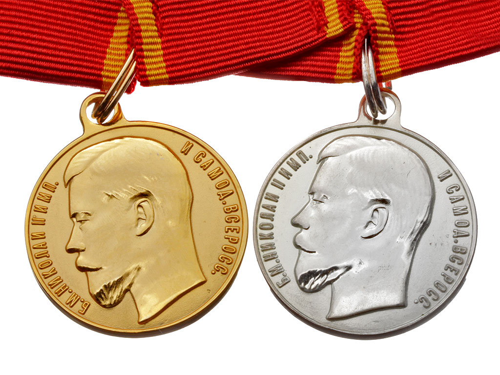 - Медаль за усердие с портретом Николая II, золото.